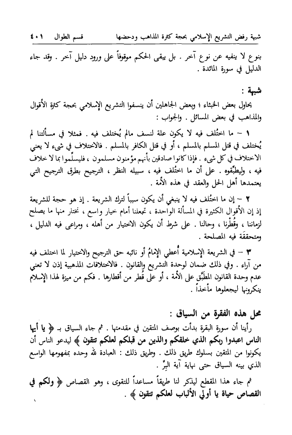 2 - إن ما اختلف فيه لا ينبغي أن يكون سببا لترك الشريعة. إذ هو حجة للشريعة إذ إن الأقوال الكثيرة في المسألة الواحدة، تجعلنا أمام خيار واسع، نختار منها ما يصلح لزماننا، وقطرنا، وحالنا. على شرط أن يكون الاختيار من أهله، ومراعى فيه الدليل، ومتحققة فيه المصلحة.
