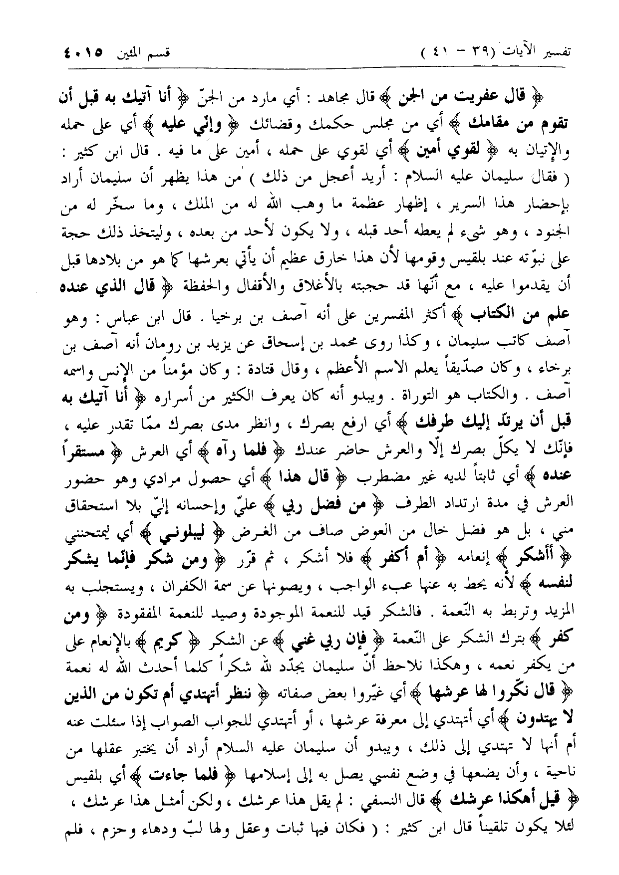 قالَ الَّذِي عِنْدَهُ عِلْمٌ مِنَ الْكِتابِ أكثر المفسرين على أنه آصف بن برخيا. قال ابن عباس: وهو آصف كاتب سليمان، وكذا روى محمد بن إسحاق عن يزيد بن رومان أنه آصف بن برخاء، وكان صديقا يعلم الاسم الأعظم، وقال قتادة: وكان مؤمنا من الإنس واسمه آصف. والكتاب هو التوراة. ويبدو أنه كان يعرف الكثير من أسراره أَنَا آتِيكَ بِهِ قَبْلَ أَنْ يَرْتَدَّ إِلَيْكَ طَرْفُكَ أي ارفع بصرك، وانظر مدى بصرك مما تقدر عليه، فإنك لا يكل بصرك إلا والعرش حاضر عندك فَلَمَّا رَآهُ أي العرش مُسْتَقِرًّا عِنْدَهُ أي ثابتا لديه غير مضطرب قالَ هذا أي حصول مرادي وهو حضور العرش في مدة ارتداد الطرف مِنْ فَضْلِ رَبِّي علي وإحسانه إلي بلا استحقاق مني، بل هو فضل خال من العوض صاف من الغرض لِيَبْلُوَنِي أي ليمتحنني أَأَشْكُرُ إنعامه أَمْ أَكْفُرُ فلا أشكر، ثم قرر وَمَنْ شَكَرَ فَإِنَّما يَشْكُرُ لِنَفْسِهِ لأنه يحط به عنها عبء الواجب، ويصونها عن سمة الكفران، ويستجلب به المزيد وتربط به النعمة. فالشكر قيد للنعمة الموجودة وصيد للنعمة المفقودة وَمَنْ كَفَرَ بترك الشكر على النعمة فَإِنَّ رَبِّي غَنِيٌّ عن الشكر كَرِيمٌ بالإنعام على من يكفر نعمه، وهكذا نلاحظ أن سليمان يجدد لله شكرا كلما أحدث الله له نعمة