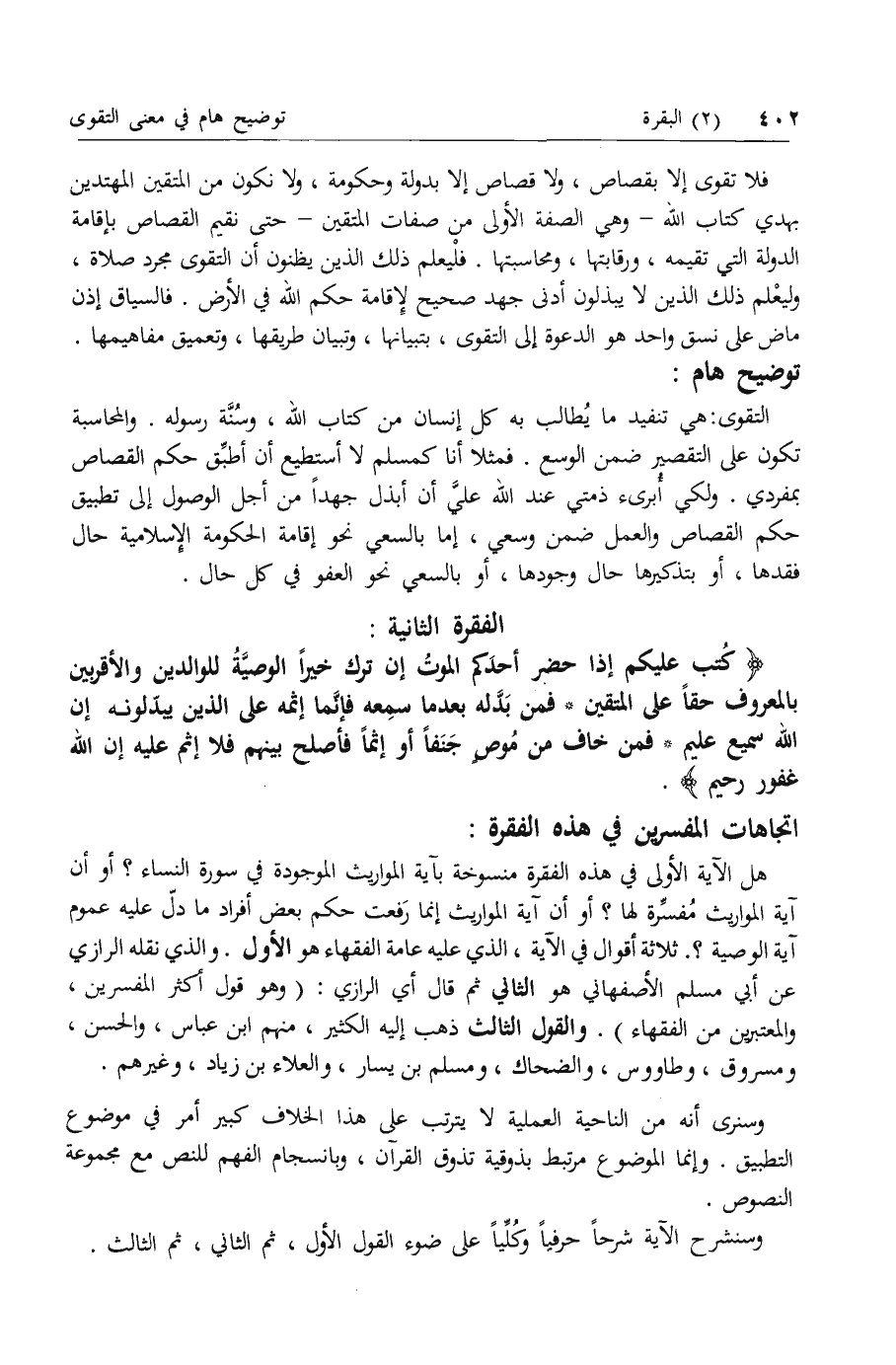 فلا تقوى إلا بقصاص، ولا قصاص إلا بدولة وحكومة، ولا نكون من المتقين المهتدين بهدي كتاب الله- وهي الصفة الأولى من صفات المتقين- حتى نقيم القصاص بإقامة الدولة التي تقيمه، ورقابتها، ومحاسبتها. فليعلم ذلك الذين يظنون أن التقوى مجرد صلاة، وليعلم ذلك الذين لا يبذلون أدنى جهد صحيح لإقامة حكم الله في الأرض. فالسياق إذن ماض على نسق واحد هو الدعوة إلى التقوى، بتبيانها، وتبيان طريقها، وتعميق مفاهيمها.