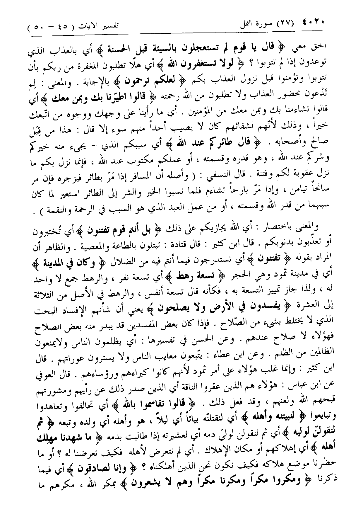 وَكانَ فِي الْمَدِينَةِ أي في مدينة ثمود وهي الحجر تِسْعَةُ رَهْطٍ أي تسعة نفر، والرهط جمع لا واحد له، ولذا جاز تمييز التسعة به، فكأنه قال تسعة أنفس، والرهط في الأصل من الثلاثة إلى العشرة يُفْسِدُونَ فِي الْأَرْضِ وَلا يُصْلِحُونَ يعني أن شأنهم الإفساد البحت الذي لا يختلط بشيء من الصلاح. فإذا كان بعض المفسدين قد يبدر منه بعض الصلاح فهؤلاء لا صلاح عندهم. وعن الحسن في تفسيرها: أي يظلمون الناس ولا يمنعون الظالمين من الظلم. وعن ابن عطاء: يتبعون معايب الناس ولا يسترون عوراتهم. قال ابن كثير: وإنما غلب هؤلاء على أمر ثمود لأنهم كانوا كبراءهم ورؤساءهم. قال العوفي عن ابن عباس: هؤلاء هم الذين عقروا الناقة أي الذين صدر ذلك عن رأيهم ومشورتهم قبحهم الله ولعنهم، وقد فعل ذلك.