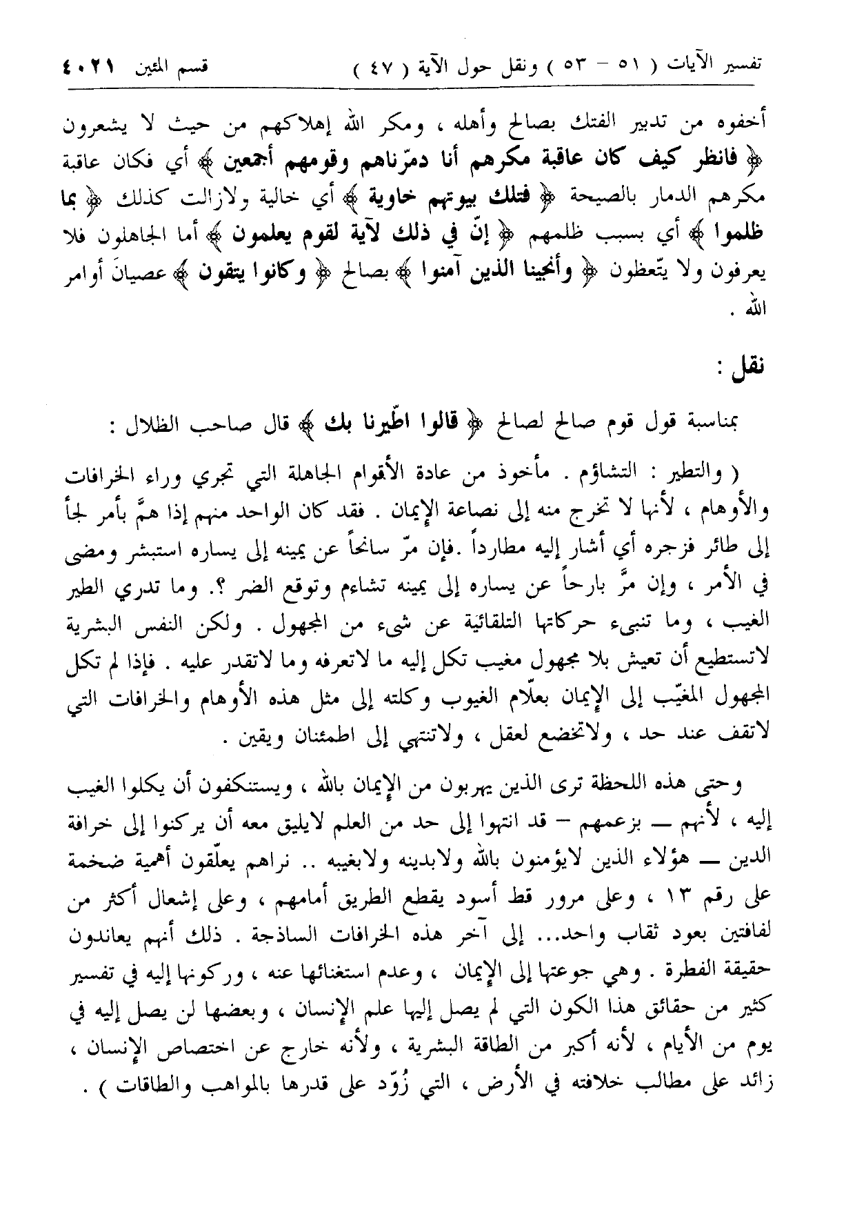 وحتى هذه اللحظة ترى الذين يهربون من الإيمان بالله، ويستنكفون أن يكلوا الغيب إليه، لأنهم- بزعمهم- قد انتهوا إلى حد من العلم لا يليق معه أن يركنوا إلى خرافة الدين- هؤلاء الذين لا يؤمنون بالله ولا بدينه ولا بغيبه .. نراهم يعلقون أهمية ضخمة على رقم 13، وعلى مرور قط أسود يقطع الطريق أمامهم، وعلى إشعال أكثر من لفافتين بعود ثقاب واحد ... إلى آخر هذه الخرافات الساذجة. ذلك أنهم يعاندون حقيقة الفطرة. وهي جوعتها إلى الإيمان، وعدم استغنائها عنه، وركونها إليه في تفسير كثير من حقائق هذا الكون التي لم يصل إليها علم الإنسان، وبعضها لن يصل إليه في يوم من الأيام، لأنه أكبر من الطاقة البشرية، ولأنه خارج عن اختصاص الإنسان، زائد على مطالب خلافته في الأرض، التي زود على قدرها بالمواهب والطاقات).