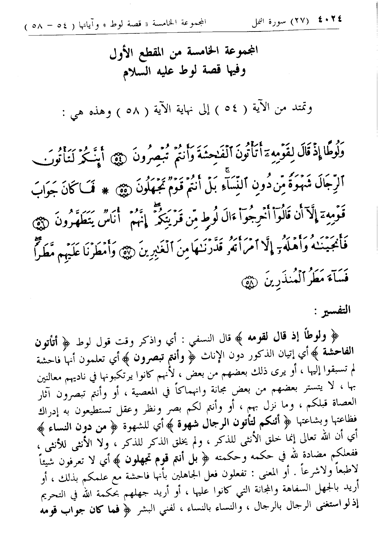 وَلُوطاً إِذْ قالَ لِقَوْمِهِ أَتَأْتُونَ الْفاحِشَةَ وَأَنْتُمْ تُبْصِرُونَ (54) أَإِنَّكُمْ لَتَأْتُونَ الرِّجالَ شَهْوَةً مِنْ دُونِ النِّساءِ بَلْ أَنْتُمْ قَوْمٌ تَجْهَلُونَ (55) فَما كانَ جَوابَ قَوْمِهِ إِلاَّ أَنْ قالُوا أَخْرِجُوا آلَ لُوطٍ مِنْ قَرْيَتِكُمْ إِنَّهُمْ أُناسٌ يَتَطَهَّرُونَ (56) فَأَنْجَيْناهُ وَأَهْلَهُ إِلاَّ امْرَأَتَهُ قَدَّرْناها مِنَ الْغابِرِينَ (57) وَأَمْطَرْنا عَلَيْهِمْ مَطَراً فَساءَ مَطَرُ الْمُنْذَرِينَ (58)