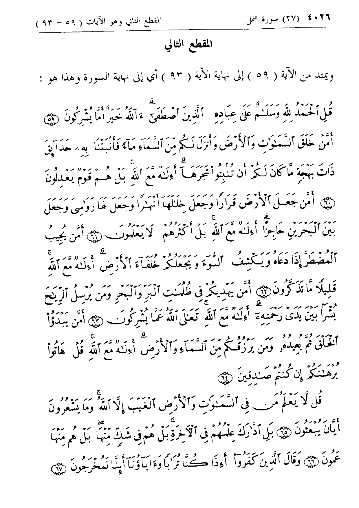 قُلِ الْحَمْدُ لِلَّهِ وَسَلامٌ عَلى عِبادِهِ الَّذِينَ اصْطَفى آللَّهُ خَيْرٌ أَمَّا يُشْرِكُونَ (59) أَمَّنْ خَلَقَ السَّماواتِ وَالْأَرْضَ وَأَنْزَلَ لَكُمْ مِنَ السَّماءِ ماءً فَأَنْبَتْنا بِهِ حَدائِقَ ذاتَ بَهْجَةٍ ما كانَ لَكُمْ أَنْ تُنْبِتُوا شَجَرَها أَإِلهٌ مَعَ اللَّهِ بَلْ هُمْ قَوْمٌ يَعْدِلُونَ (60) أَمَّنْ جَعَلَ الْأَرْضَ قَراراً وَجَعَلَ خِلالَها أَنْهاراً وَجَعَلَ لَها رَواسِيَ وَجَعَلَ بَيْنَ الْبَحْرَيْنِ حاجِزاً أَإِلهٌ مَعَ اللَّهِ بَلْ أَكْثَرُهُمْ لا يَعْلَمُونَ (61) أَمَّنْ يُجِيبُ الْمُضْطَرَّ إِذا دَعاهُ وَيَكْشِفُ السُّوءَ وَيَجْعَلُكُمْ خُلَفاءَ الْأَرْضِ أَإِلهٌ مَعَ اللَّهِ قَلِيلاً ما تَذَكَّرُونَ (62) أَمَّنْ يَهْدِيكُمْ فِي ظُلُماتِ الْبَرِّ وَالْبَحْرِ وَمَنْ يُرْسِلُ الرِّياحَ بُشْراً بَيْنَ يَدَيْ رَحْمَتِهِ أَإِلهٌ مَعَ اللَّهِ تَعالَى اللَّهُ عَمَّا يُشْرِكُونَ (63)