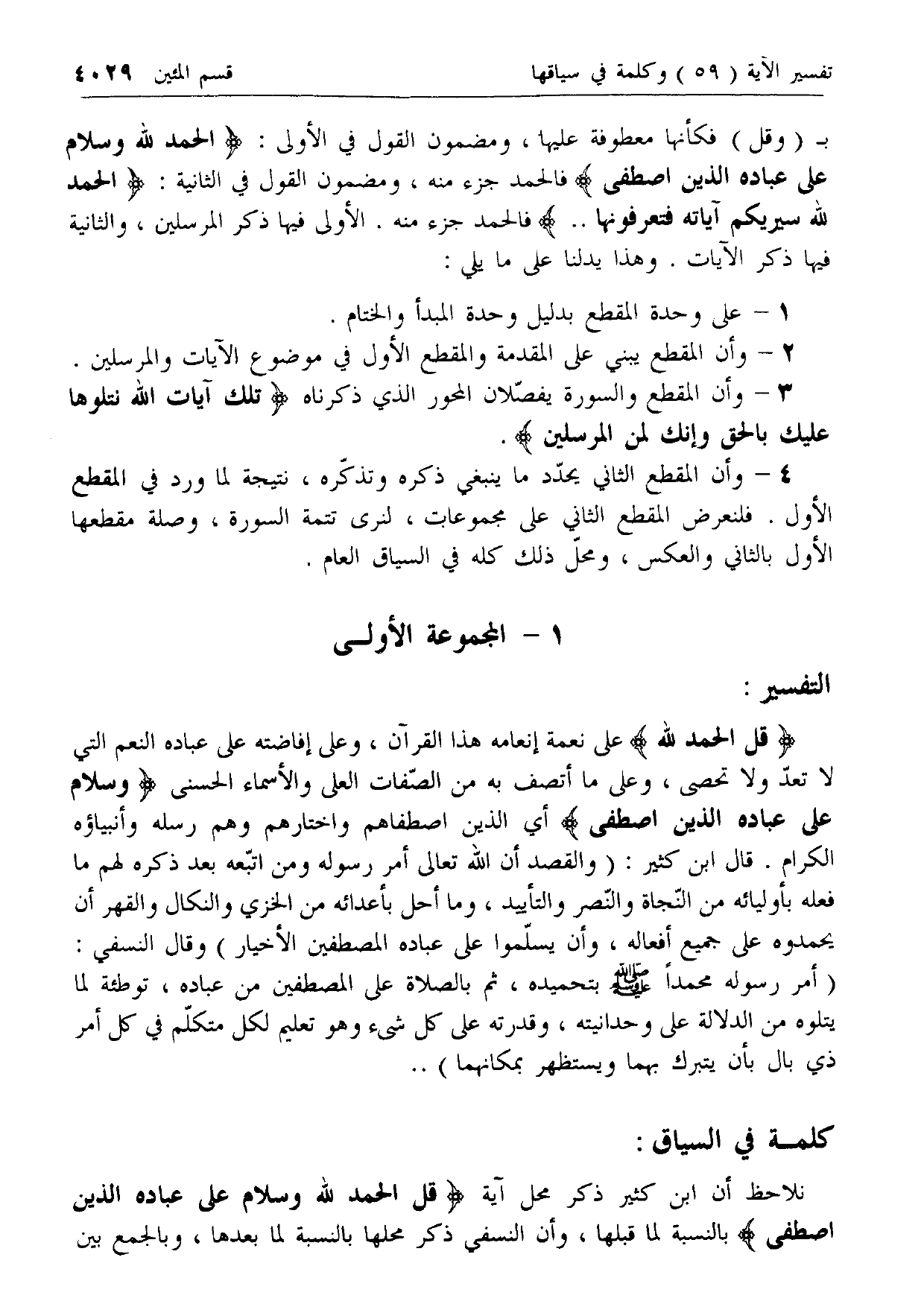 نلاحظ أن ابن كثير ذكر محل آية قُلِ الْحَمْدُ لِلَّهِ وَسَلامٌ عَلى عِبادِهِ الَّذِينَ اصْطَفى بالنسبة لما قبلها، وأن النسفي ذكر محلها بالنسبة لما بعدها، وبالجمع بين