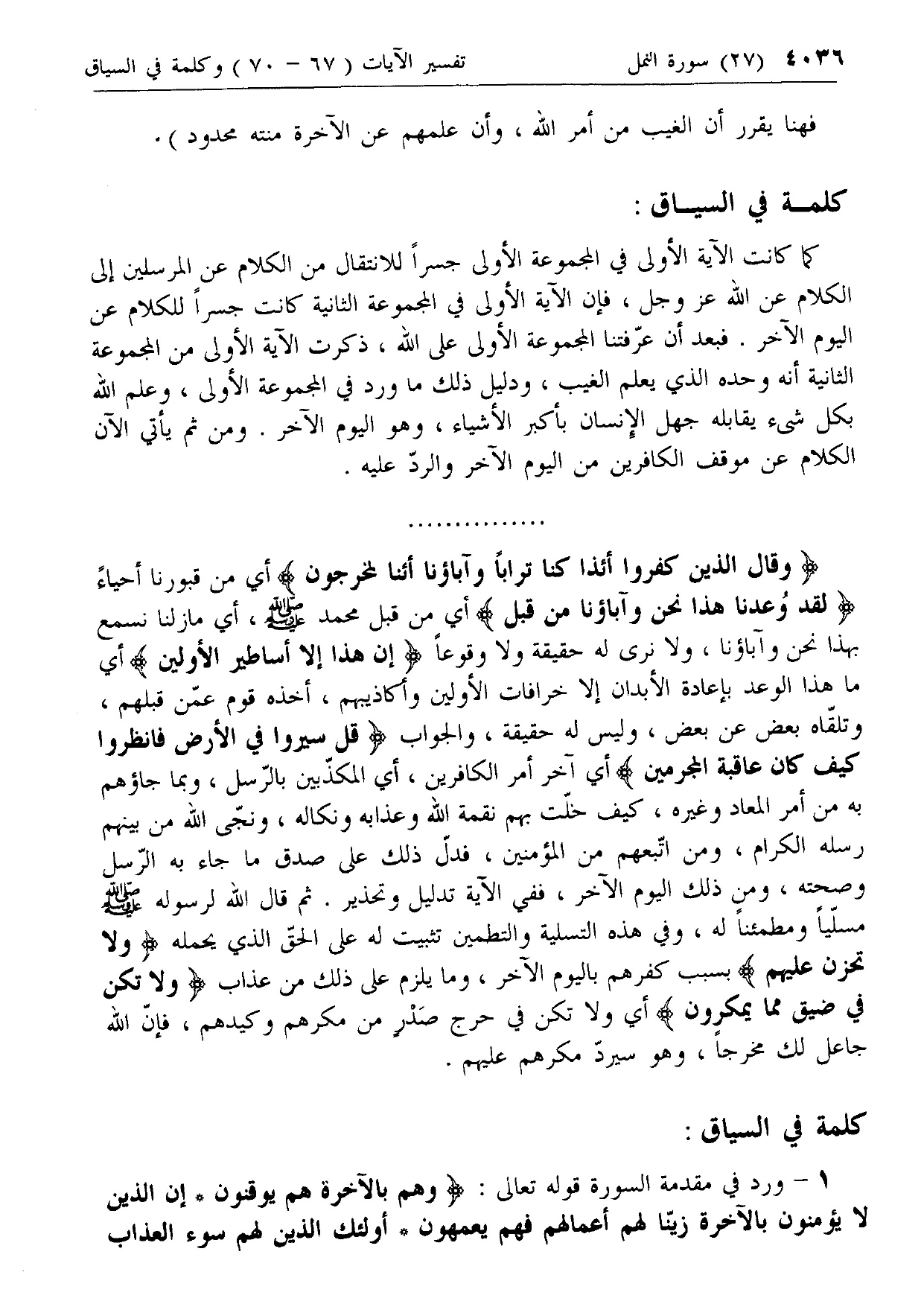 1 - ورد في مقدمة السورة قوله تعالى: وَهُمْ بِالْآخِرَةِ هُمْ يُوقِنُونَ* إِنَّ الَّذِينَ لا يُؤْمِنُونَ بِالْآخِرَةِ زَيَّنَّا لَهُمْ أَعْمالَهُمْ فَهُمْ يَعْمَهُونَ* أُوْلئِكَ الَّذِينَ لَهُمْ سُوءُ الْعَذابِ