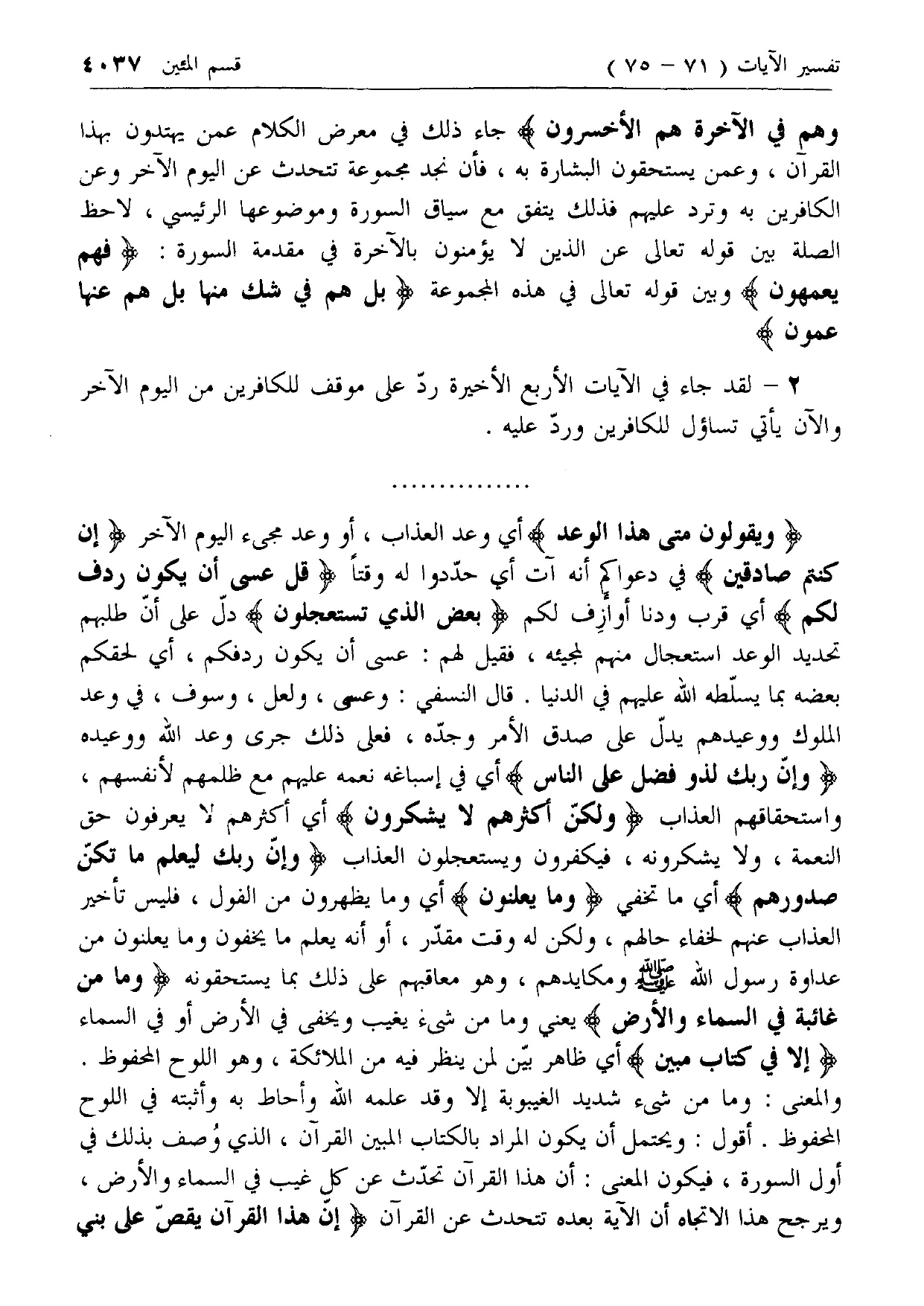 وَهُمْ فِي الْآخِرَةِ هُمُ الْأَخْسَرُونَ جاء ذلك في معرض الكلام عمن يهتدون بهذا القرآن، وعمن يستحقون البشارة به، فإن نجد مجموعة تتحدث عن اليوم الآخر وعن الكافرين به وترد عليهم فذلك يتفق مع سياق السورة وموضوعها الرئيسي، لاحظ الصلة بين قوله تعالى عن الذين لا يؤمنون بالآخرة في مقدمة السورة: فَهُمْ يَعْمَهُونَ وبين قوله تعالى في هذه المجموعة بَلْ هُمْ فِي شَكٍّ مِنْها بَلْ هُمْ مِنْها عَمُونَ