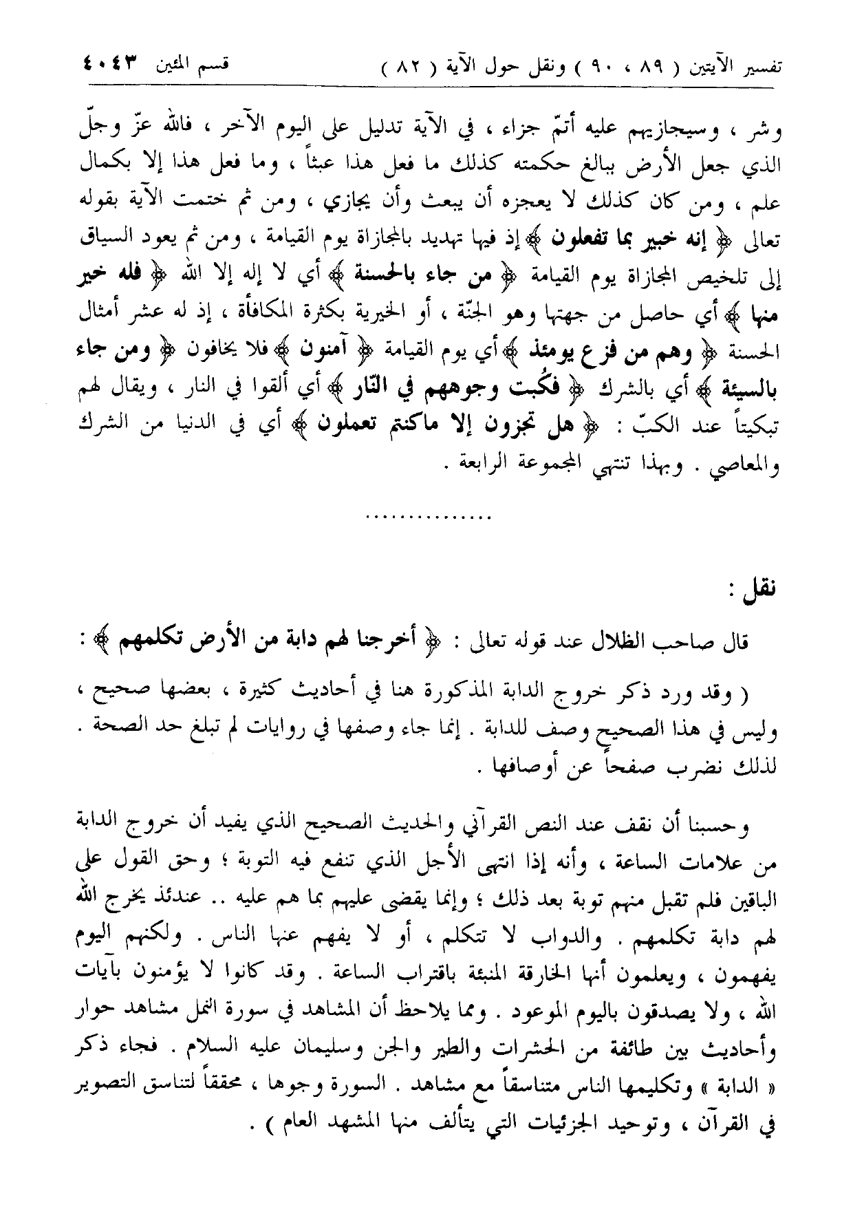 وحسبنا أن نقف عند النص القرآني والحديث الصحيح الذي يفيد أن خروج الدابة من علامات الساعة، وأنه إذا انتهى الأجل الذي تنفع فيه التوبة؛ وحق القول على الباقين فلم تقبل منهم توبة بعد ذلك؛ وإنما يقضى عليهم بما هم عليه .. عندئذ يخرج الله لهم دابة تكلمهم. والدواب لا تتكلم، أو لا يفهم عنها الناس. ولكنهم اليوم يفهمون، ويعلمون أنها الخارقة المنبئة باقتراب الساعة. وقد كانوا لا يؤمنون بآيات الله، ولا يصدقون باليوم الموعود. ومما يلاحظ أن المشاهد في سورة النمل مشاهد حوار وأحاديث بين طائفة من الحشرات والطير والجن وسليمان عليه السلام. فجاء ذكر «الدابة» وتكليمها الناس متناسقا مع مشاهد. السورة وجوها، محققا لتناسق التصوير في القرآن، وتوحيد الجزئيات التي يتألف منها المشهد العام).