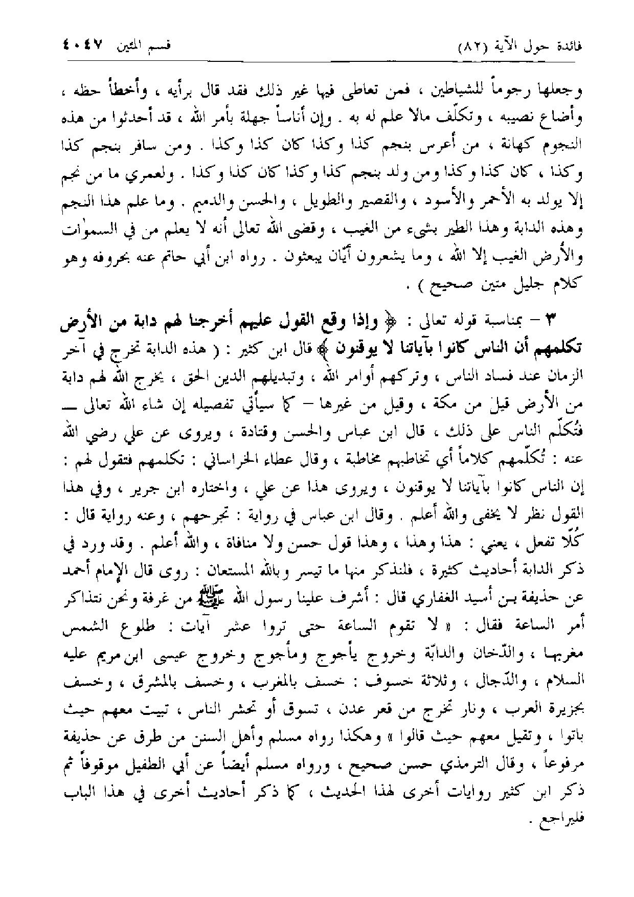 3 - بمناسبة قوله تعالى: وَإِذا وَقَعَ الْقَوْلُ عَلَيْهِمْ أَخْرَجْنا لَهُمْ دَابَّةً مِنَ الْأَرْضِ تُكَلِّمُهُمْ أَنَّ النَّاسَ كانُوا بِآياتِنا لا يُوقِنُونَ قال ابن كثير: (هذه الدابة تخرج في آخر الزمان عند فساد الناس، وتركهم أوامر الله، وتبديلهم الدين الحق، يخرج الله لهم دابة من الأرض قيل من مكة، وقيل من غيرها- كما سيأتي تفصيله إن شاء الله تعالى- فتكلم الناس على ذلك، قال ابن عباس والحسن وقتادة، ويروى عن علي رضي الله عنه: تكلمهم كلاما أي تخاطبهم مخاطبة، وقال عطاء الخراساني: تكلمهم فتقول لهم: