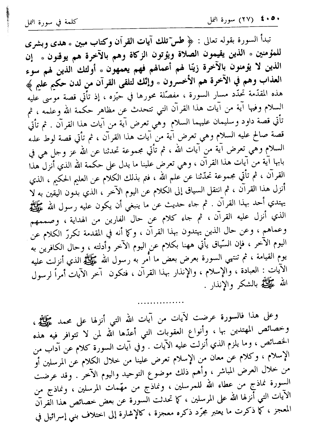 تبدأ السورة بقوله تعالى: طس تِلْكَ آياتُ الْقُرْآنِ وَكِتابٍ مُبِينٍ* هُدىً وَبُشْرى لِلْمُؤْمِنِينَ* الَّذِينَ يُقِيمُونَ الصَّلاةَ وَيُؤْتُونَ الزَّكاةَ وَهُمْ بِالْآخِرَةِ هُمْ يُوقِنُونَ* إِنَّ الَّذِينَ لا يُؤْمِنُونَ بِالْآخِرَةِ زَيَّنَّا لَهُمْ أَعْمالَهُمْ فَهُمْ يَعْمَهُونَ* أُوْلئِكَ الَّذِينَ لَهُمْ سُوءُ الْعَذابِ وَهُمْ فِي الْآخِرَةِ هُمُ الْأَخْسَرُونَ* وَإِنَّكَ لَتُلَقَّى الْقُرْآنَ مِنْ لَدُنْ حَكِيمٍ عَلِيمٍ هذه المقدمة تحدد مسار السورة، مفصلة محورها في حيزه، إذ تأتي قصة موسى عليه السلام وفيها آية من آيات هذا القرآن التي تتحدث عن مظاهر حكمة الله وعلمه، ثم تأتي قصة داود وسليمان عليهما السلام وهي تعرض آية من آيات هذا القرآن. ثم تأتي قصة صالح عليه السلام وهي تعرض آية من آيات هذا القرآن، ثم تأتي قصة لوط عليه السلام وهي تعرض آية من آيات الله، ثم تأتي مجموعة تحدثنا عن الله عزّ وجل هي في بابها آية من آيات هذا القرآن، وهي تعرض علينا ما يدل على حكمة الله الذي أنزل هذا القرآن، ثم تأتي مجموعة تحدثنا عن علم الله، فتم بذلك الكلام عن العليم الحكيم، الذي أنزل هذا القرآن، ثم انتقل السياق إلى الكلام عن اليوم الآخر، الذي بدون اليقين به لا يهتدي أحد بهذا القرآن. ثم جاء حديث عن ما ينبغي أن يكون عليه رسول الله صلى الله عليه وسلم الذي أنزل عليه القرآن، ثم جاء كلام عن حال الفارين من الهداية، وصممهم وعماهم، وعن حال الذين يهتدون بهذا القرآن، وكما أنه في المقدمة تكرر الكلام عن اليوم الآخر، فإن السياق يأتي هاهنا بكلام عن اليوم الآخر وأدلته، وحال الكافرين به يوم القيامة، ثم تنتهي السورة بعرض بعض ما أمر به رسول الله صلى الله عليه وسلم الذي أنزلت عليه الآيات: العبادة، والإسلام، والإنذار بهذا القرآن، فتكون آخر الآيات أمرا لرسول الله صلى الله عليه وسلم بالشكر والإنذار.