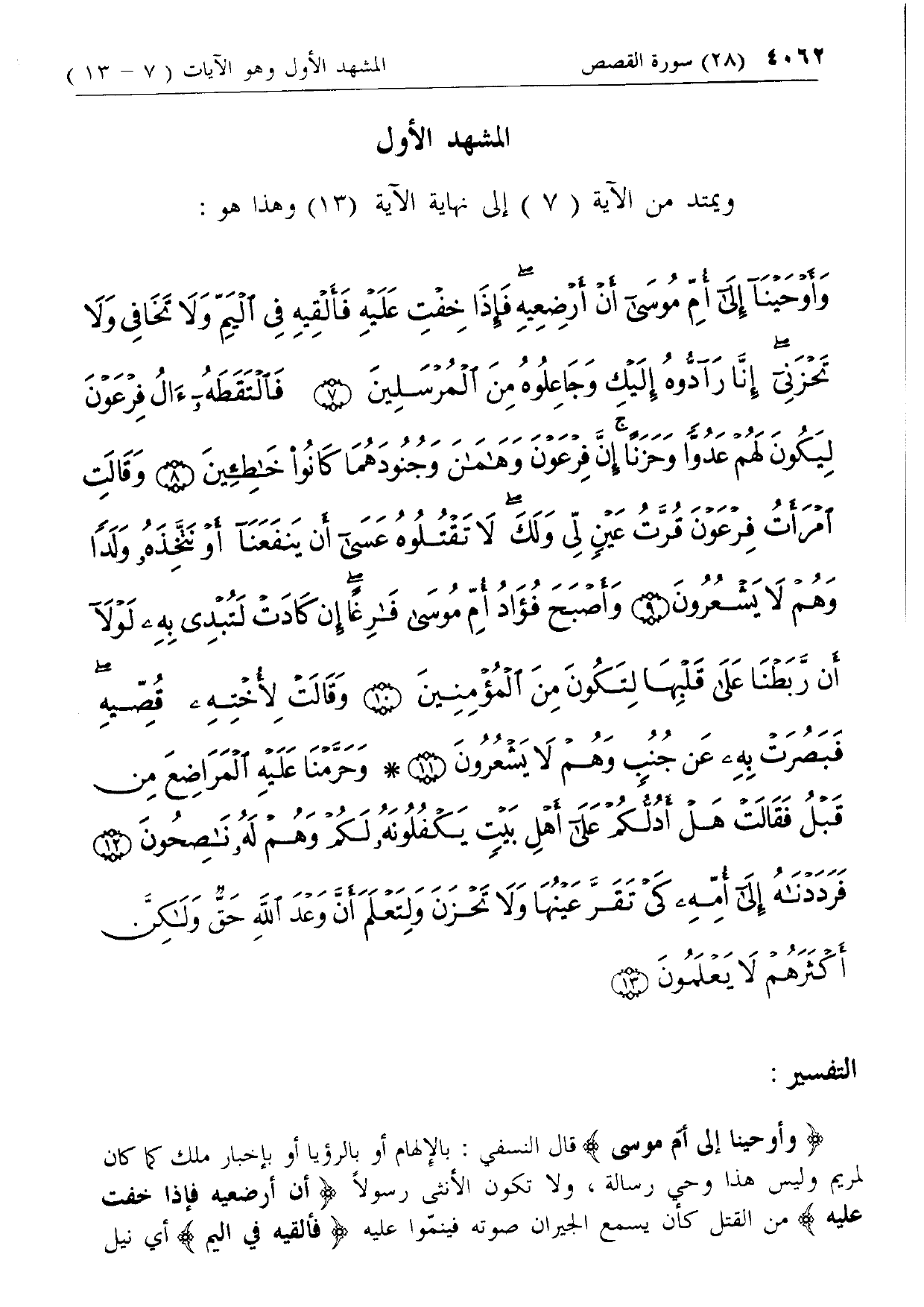 وَأَوْحَيْنا إِلى أُمِّ مُوسى أَنْ أَرْضِعِيهِ فَإِذا خِفْتِ عَلَيْهِ فَأَلْقِيهِ فِي الْيَمِّ وَلا تَخافِي وَلا تَحْزَنِي إِنَّا رَادُّوهُ إِلَيْكِ وَجاعِلُوهُ مِنَ الْمُرْسَلِينَ (7) فَالْتَقَطَهُ آلُ فِرْعَوْنَ لِيَكُونَ لَهُمْ عَدُوًّا وَحَزَناً إِنَّ فِرْعَوْنَ وَهامانَ وَجُنُودَهُما كانُوا خاطِئِينَ (8) وَقالَتِ امْرَأَتُ فِرْعَوْنَ قُرَّتُ عَيْنٍ لِي وَلَكَ لا تَقْتُلُوهُ عَسى أَنْ يَنْفَعَنا أَوْ نَتَّخِذَهُ وَلَداً وَهُمْ لا يَشْعُرُونَ (9) وَأَصْبَحَ فُؤادُ أُمِّ مُوسى فارِغاً إِنْ كادَتْ لَتُبْدِي بِهِ لَوْلا أَنْ رَبَطْنا عَلى قَلْبِها لِتَكُونَ مِنَ الْمُؤْمِنِينَ (10) وَقالَتْ لِأُخْتِهِ قُصِّيهِ فَبَصُرَتْ بِهِ عَنْ جُنُبٍ وَهُمْ لا يَشْعُرُونَ (11)