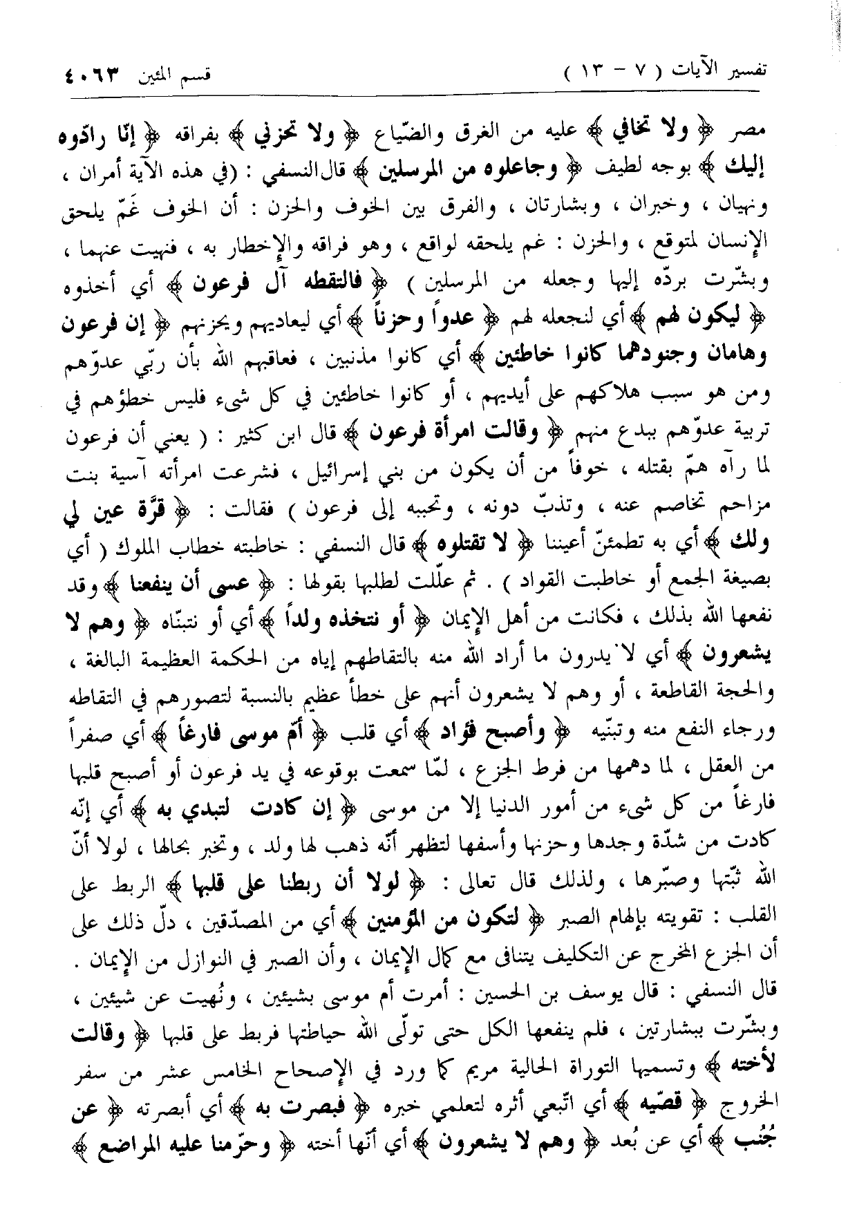 مصر وَلا تَخافِي عليه من الغرق والضياع وَلا تَحْزَنِي بفراقه إِنَّا رَادُّوهُ إِلَيْكِ بوجه لطيف وَجاعِلُوهُ مِنَ الْمُرْسَلِينَ قال النسفي: (في هذه الآية أمران، ونهيان، وخبران، وبشارتان، والفرق بين الخوف والحزن: أن الخوف غم يلحق الإنسان لمتوقع، والحزن: غم يلحقه لواقع، وهو فراقه والإخطار به، فنهيت عنهما، وبشرت برده إليها وجعله من المرسلين)