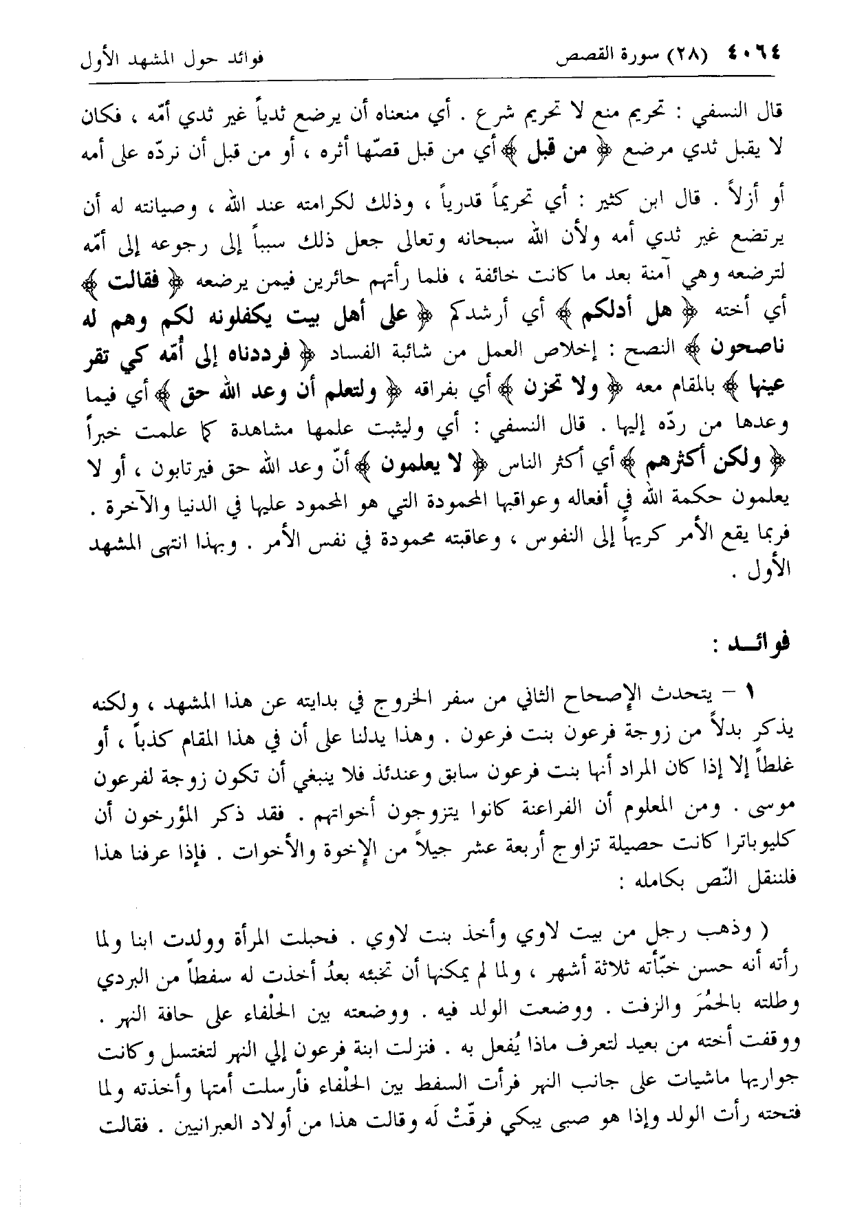 قال النسفي: تحريم منع لا تحريم شرع. أي منعناه أن يرضع ثديا غير ثدي أمه، فكان لا يقبل ثدي مرضع مِنْ قَبْلُ أي من قبل قصها أثره، أو من قبل أن نرده على أمه أو أزلا. قال ابن كثير: أي تحريما قدريا، وذلك لكرامته عند الله، وصيانته له أن يرتضع غير ثدي أمه ولأن الله سبحانه وتعالى جعل ذلك سببا إلى رجوعه إلى أمه لترضعه وهي آمنة بعد ما كانت خائفة، فلما رأتهم حائرين فيمن يرضعه فَقالَتْ أي أخته هَلْ أَدُلُّكُمْ أي أرشدكم عَلى أَهْلِ بَيْتٍ يَكْفُلُونَهُ لَكُمْ وَهُمْ لَهُ ناصِحُونَ النصح: إخلاص العمل من شائبة الفساد