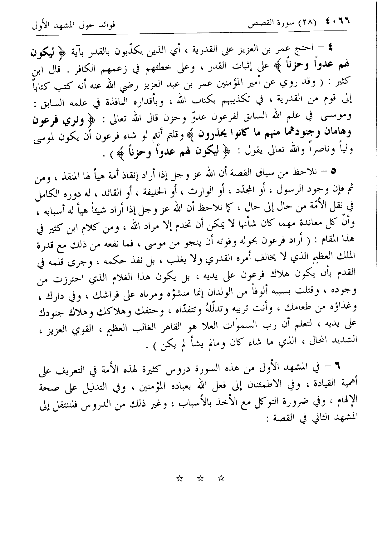 4 - احتج عمر بن العزيز على القدرية، أي الذين يكذبون بالقدر بآية لِيَكُونَ لَهُمْ عَدُوًّا وَحَزَناً على إثبات القدر، وعلى خطئهم في زعمهم الكافر. قال ابن كثير: (وقد روي عن أمير المؤمنين عمر بن عبد العزيز رضي الله عنه أنه كتب كتابا إلى قوم من القدرية، في تكذيبهم بكتاب الله، وبأقداره النافذة في علمه السابق: