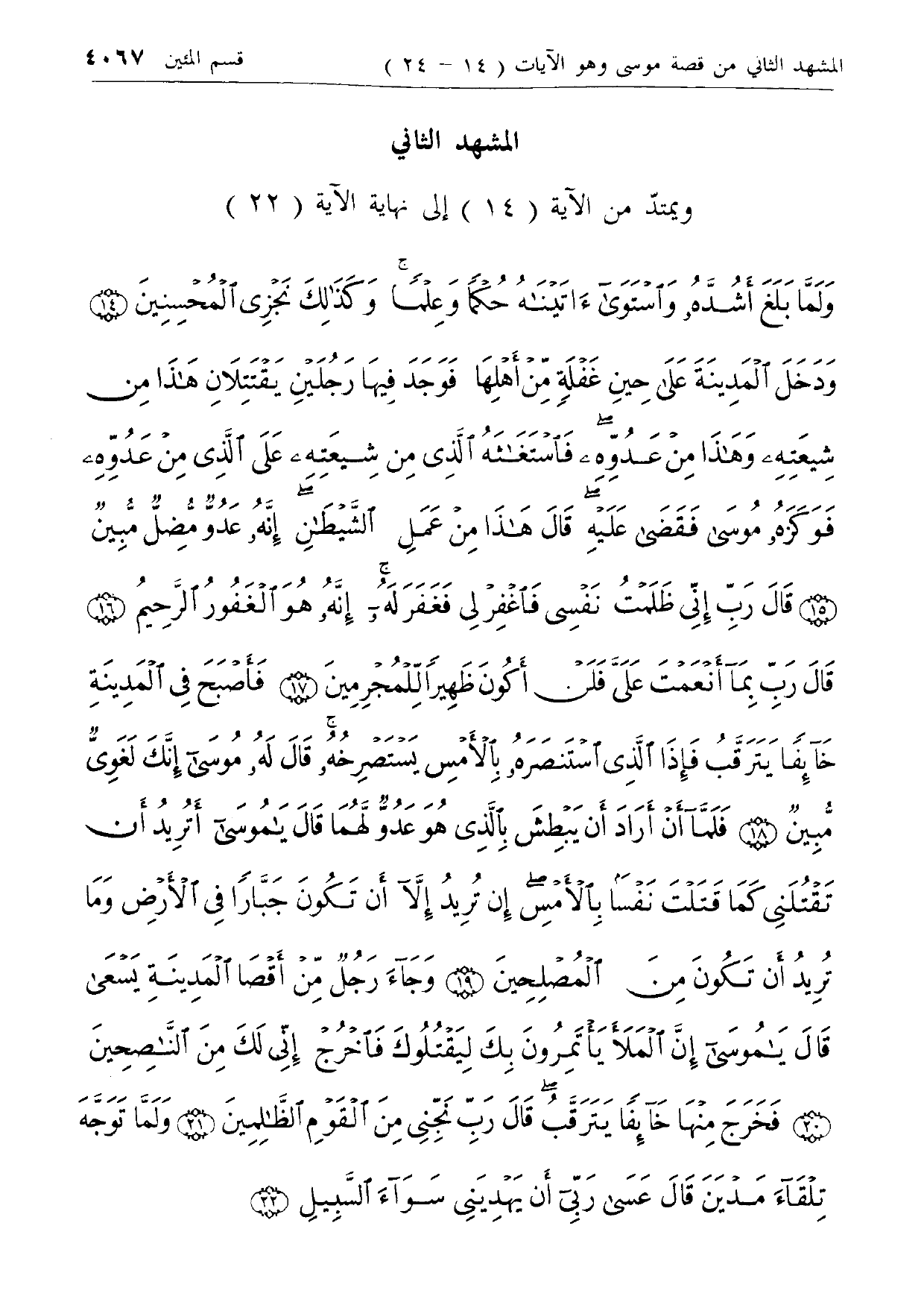 وَلَمَّا بَلَغَ أَشُدَّهُ وَاسْتَوى آتَيْناهُ حُكْماً وَعِلْماً وَكَذلِكَ نَجْزِي الْمُحْسِنِينَ (14) وَدَخَلَ الْمَدِينَةَ عَلى حِينِ غَفْلَةٍ مِنْ أَهْلِها فَوَجَدَ فِيها رَجُلَيْنِ يَقْتَتِلانِ هذا مِنْ شِيعَتِهِ وَهذا مِنْ عَدُوِّهِ فَاسْتَغاثَهُ الَّذِي مِنْ شِيعَتِهِ عَلَى الَّذِي مِنْ عَدُوِّهِ فَوَكَزَهُ مُوسى فَقَضى عَلَيْهِ قالَ هذا مِنْ عَمَلِ الشَّيْطانِ إِنَّهُ عَدُوٌّ مُضِلٌّ مُبِينٌ (15) قالَ رَبِّ إِنِّي ظَلَمْتُ نَفْسِي فَاغْفِرْ لِي فَغَفَرَ لَهُ إِنَّهُ هُوَ الْغَفُورُ الرَّحِيمُ (16) قالَ رَبِّ بِما أَنْعَمْتَ عَلَيَّ فَلَنْ أَكُونَ ظَهِيراً لِلْمُجْرِمِينَ (17) فَأَصْبَحَ فِي الْمَدِينَةِ خائِفاً يَتَرَقَّبُ فَإِذَا الَّذِي اسْتَنْصَرَهُ بِالْأَمْسِ يَسْتَصْرِخُهُ قالَ لَهُ مُوسى إِنَّكَ لَغَوِيٌّ مُبِينٌ (18)