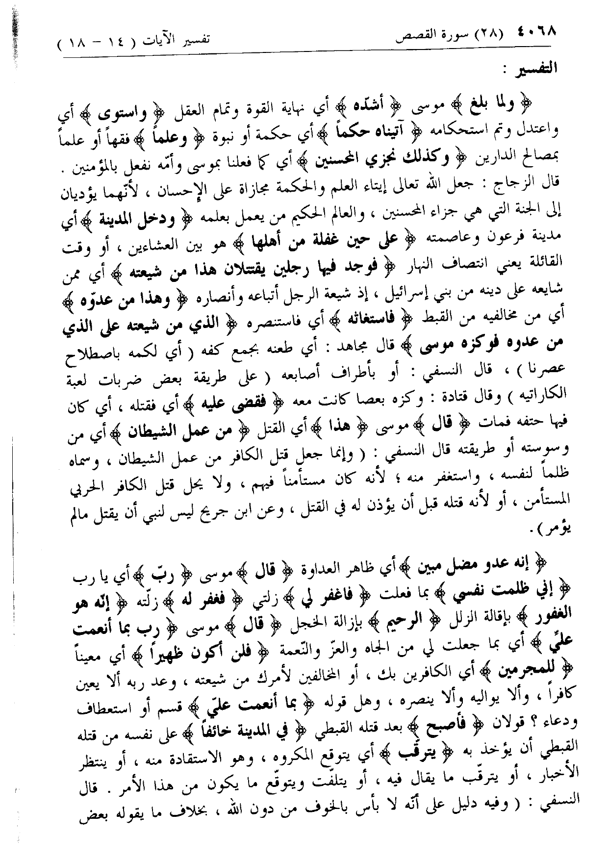 وَدَخَلَ الْمَدِينَةَ أي مدينة فرعون وعاصمته عَلى حِينِ غَفْلَةٍ مِنْ أَهْلِها هو بين العشاءين، أو وقت القائلة يعني انتصاف النهار فَوَجَدَ فِيها رَجُلَيْنِ يَقْتَتِلانِ هذا مِنْ شِيعَتِهِ أي ممن شايعه على دينه من بني إسرائيل، إذ شيعة الرجل أتباعه وأنصاره وَهذا مِنْ عَدُوِّهِ أي من مخالفيه من القبط فَاسْتَغاثَهُ أي فاستنصره الَّذِي مِنْ شِيعَتِهِ عَلَى الَّذِي مِنْ عَدُوِّهِ فَوَكَزَهُ مُوسى قال مجاهد: أي طعنه بجمع كفه (أي لكمه باصطلاح عصرنا)، قال النسفي: أو بأطراف أصابعه (على طريقة بعض ضربات لعبة الكاراتية) وقال قتادة: وكزه بعصا كانت معه فَقَضى عَلَيْهِ أي فقتله، أي كان فيها حتفه فمات قالَ موسى هذا أي القتل مِنْ عَمَلِ الشَّيْطانِ أي من وسوسته أو طريقته قال النسفي: (وإنما جعل قتل الكافر من عمل الشيطان، وسماه ظلما لنفسه، واستغفر منه؛ لأنه كان مستأمنا فيهم، ولا يحل قتل الكافر الحربي المستأمن، أو لأنه قتله قبل أن يؤذن له في القتل، وعن ابن جريح ليس لنبي أن يقتل ما لم يؤمر).