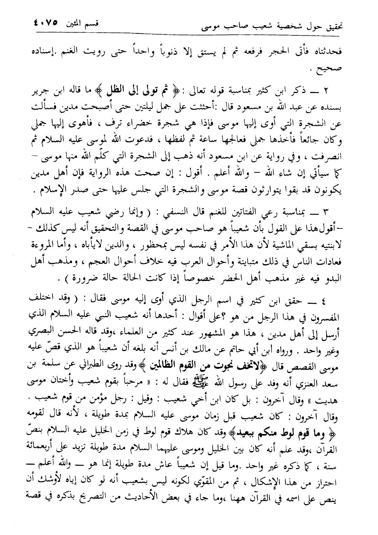 4 - حقق ابن كثير في اسم الرجل الذي أوى إليه موسى فقال: (وقد اختلف المفسرون في هذا الرجل من هو؟ على أقوال: أحدها أنه شعيب النبي عليه السلام الذي أرسل إلى أهل مدين، هذا هو المشهور عند كثير من العلماء، وقد قاله الحسن البصري وغير واحد. ورواه ابن أبي حاتم عن مالك بن أنس أنه بلغه أن شعيبا هو الذي قص عليه موسى القصص قال لا تَخَفْ نَجَوْتَ مِنَ الْقَوْمِ الظَّالِمِينَ وقد روى الطبراني عن سلمة بن سعد العنزي أنه وفد على رسول الله صلى الله عليه وسلم فقال له: «مرحبا بقوم شعيب وأختان موسى هديت» وقال آخرون: بل كان ابن أخي شعيب: وقيل: رجل مؤمن من قوم شعيب.