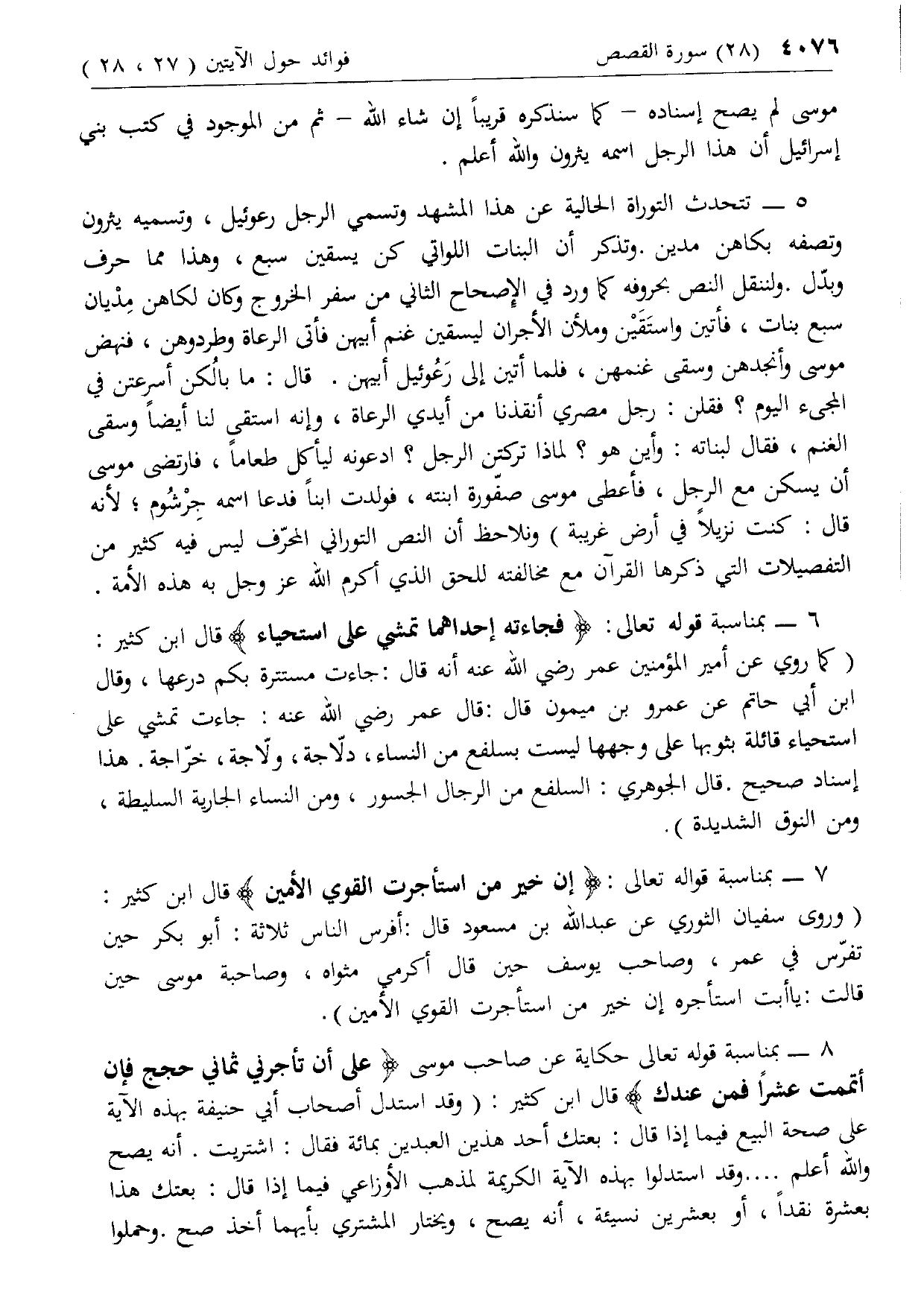 8 - بمناسبة قوله تعالى حكاية عن صاحب موسى عَلى أَنْ تَأْجُرَنِي ثَمانِيَ حِجَجٍ فَإِنْ أَتْمَمْتَ عَشْراً فَمِنْ عِنْدِكَ قال ابن كثير: (وقد استدل أصحاب أبي حنيفة بهذه الآية على صحة البيع فيما إذا قال: بعتك أحد هذين العبدين بمائة فقال: اشتريت. أنه يصح والله أعلم .... وقد استدلوا بهذه الآية الكريمة لمذهب الأوزاعي فيما إذا قال: بعتك هذا بعشرة نقدا، أو بعشرين نسيئة، أنه يصح، ويختار المشتري بأيهما أخذ صح. وحملوا