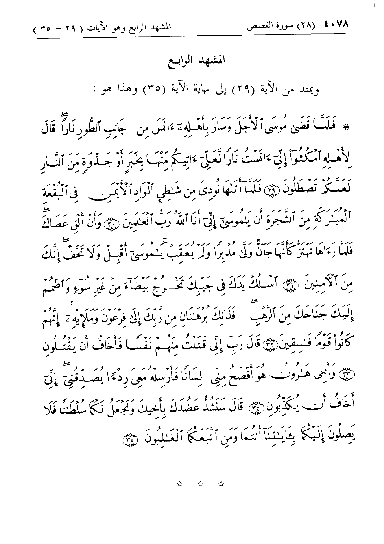فَلَمَّا قَضى مُوسَى الْأَجَلَ وَسارَ بِأَهْلِهِ آنَسَ مِنْ جانِبِ الطُّورِ ناراً قالَ لِأَهْلِهِ امْكُثُوا إِنِّي آنَسْتُ ناراً لَعَلِّي آتِيكُمْ مِنْها بِخَبَرٍ أَوْ جَذْوَةٍ مِنَ النَّارِ لَعَلَّكُمْ تَصْطَلُونَ (29) فَلَمَّا أَتاها نُودِيَ مِنْ شاطِئِ الْوادِ الْأَيْمَنِ فِي الْبُقْعَةِ الْمُبارَكَةِ مِنَ الشَّجَرَةِ أَنْ يا مُوسى إِنِّي أَنَا اللَّهُ رَبُّ الْعالَمِينَ (30) وَأَنْ أَلْقِ عَصاكَ فَلَمَّا رَآها تَهْتَزُّ كَأَنَّها جَانٌّ وَلَّى مُدْبِراً وَلَمْ يُعَقِّبْ يا مُوسى أَقْبِلْ وَلا تَخَفْ إِنَّكَ مِنَ الْآمِنِينَ (31) اسْلُكْ يَدَكَ فِي جَيْبِكَ تَخْرُجْ بَيْضاءَ مِنْ غَيْرِ سُوءٍ وَاضْمُمْ إِلَيْكَ جَناحَكَ مِنَ الرَّهْبِ فَذانِكَ بُرْهانانِ مِنْ رَبِّكَ إِلى فِرْعَوْنَ وَمَلائِهِ إِنَّهُمْ كانُوا قَوْماً فاسِقِينَ (32) قالَ رَبِّ إِنِّي قَتَلْتُ مِنْهُمْ نَفْساً فَأَخافُ أَنْ يَقْتُلُونِ (33)