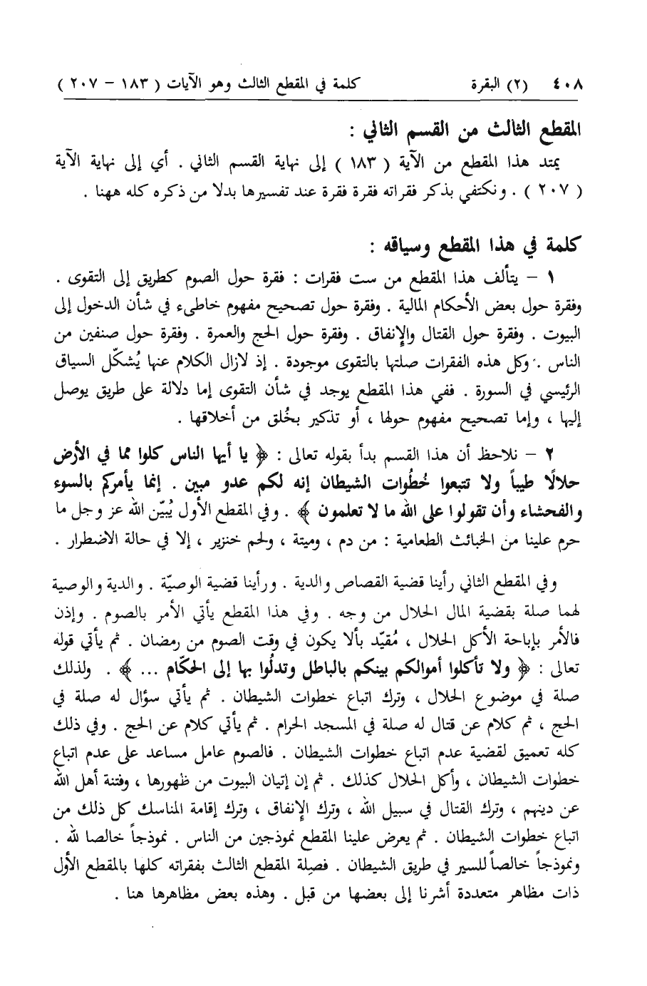 يمتد هذا المقطع من الآية (183) إلى نهاية القسم الثاني. أي إلى نهاية الآية (207). ونكتفي بذكر فقراته فقرة فقرة عند تفسيرها بدلا من ذكره كله هاهنا.