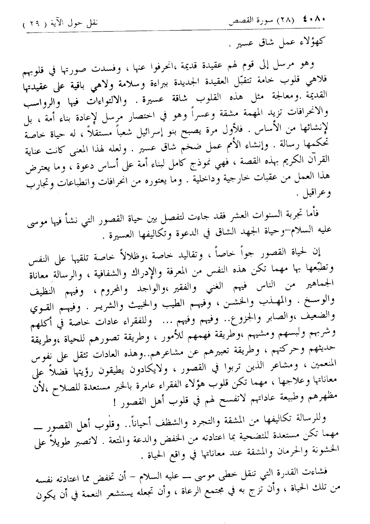 إن لحياة القصور جوا خاصا، وتقاليد خاصة، وظلالا خاصة تلقيها على النفس وتطبعها بها مهما تكن هذه النفس من المعرفة والإدراك والشفافية، والرسالة معاناة الجماهير من الناس فيهم الغني والفقير، والواجد والمحروم، وفيهم النظيف والوسخ. والمهذب والخشن، وفيهم الطيب والخبيث والشرير. وفيهم القوي والضعيف، والصابر والجزوع .. وفيهم وفيهم ... وللفقراء عادات خاصة في أكلهم وشربهم ولبسهم ومشيهم، وطريقة فهمهم للأمور، وطريقة تصورهم للحياة، وطريقة حديثهم وحركتهم، وطريقة تعبيرهم عن مشاعرهم .. وهذه العادات تثقل على نفوس المنعمين، ومشاعر الذين تربوا في القصور، ولا يكادون يطيقون رؤيتها فضلا على معاناتها وعلاجها، مهما تكن قلوب هؤلاء الفقراء عامرة بالخبر مستعدة للصلاح، لأن مظهرهم وطبيعة عاداتهم لا تفسح لهم في قلوب أهل القصور!