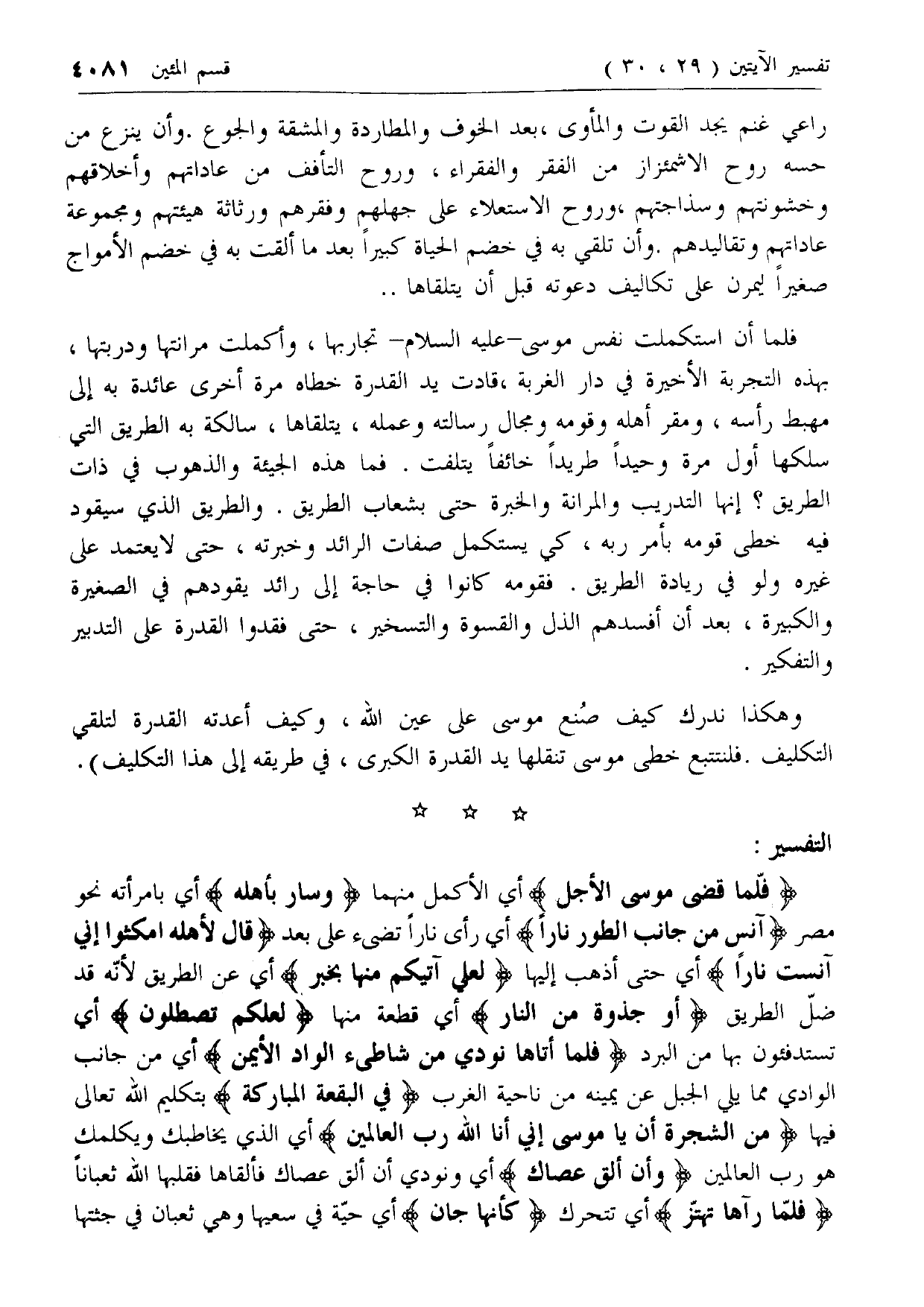 وهكذا ندرك كيف صنع موسى على عين الله، وكيف أعدته القدرة لتلقي التكليف. فلنتتبع خطى موسى تنقلها يد القدرة الكبرى، في طريقه إلى هذا التكليف).
