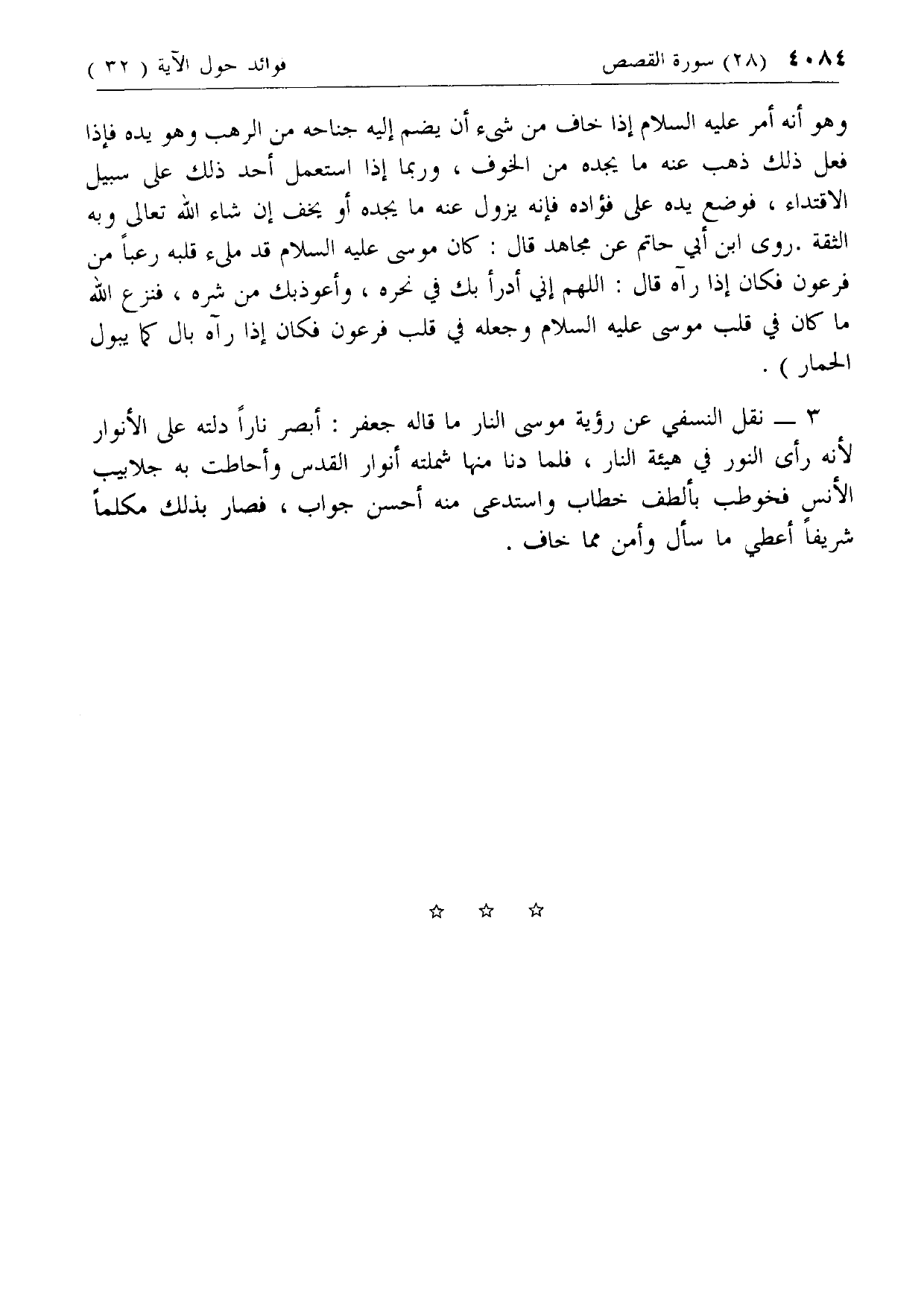 3 - نقل النسفي عن رؤية موسى النار ما قاله جعفر: أبصر نارا دلته على الأنوار لأنه رأى النور في هيئة النار، فلما دنا منها شملته أنوار القدس وأحاطت به جلابيب الأنس فخوطب بألطف خطاب واستدعى منه أحسن جواب، فصار بذلك مكلما شريفا أعطي ما سأل وأمن مما خاف.