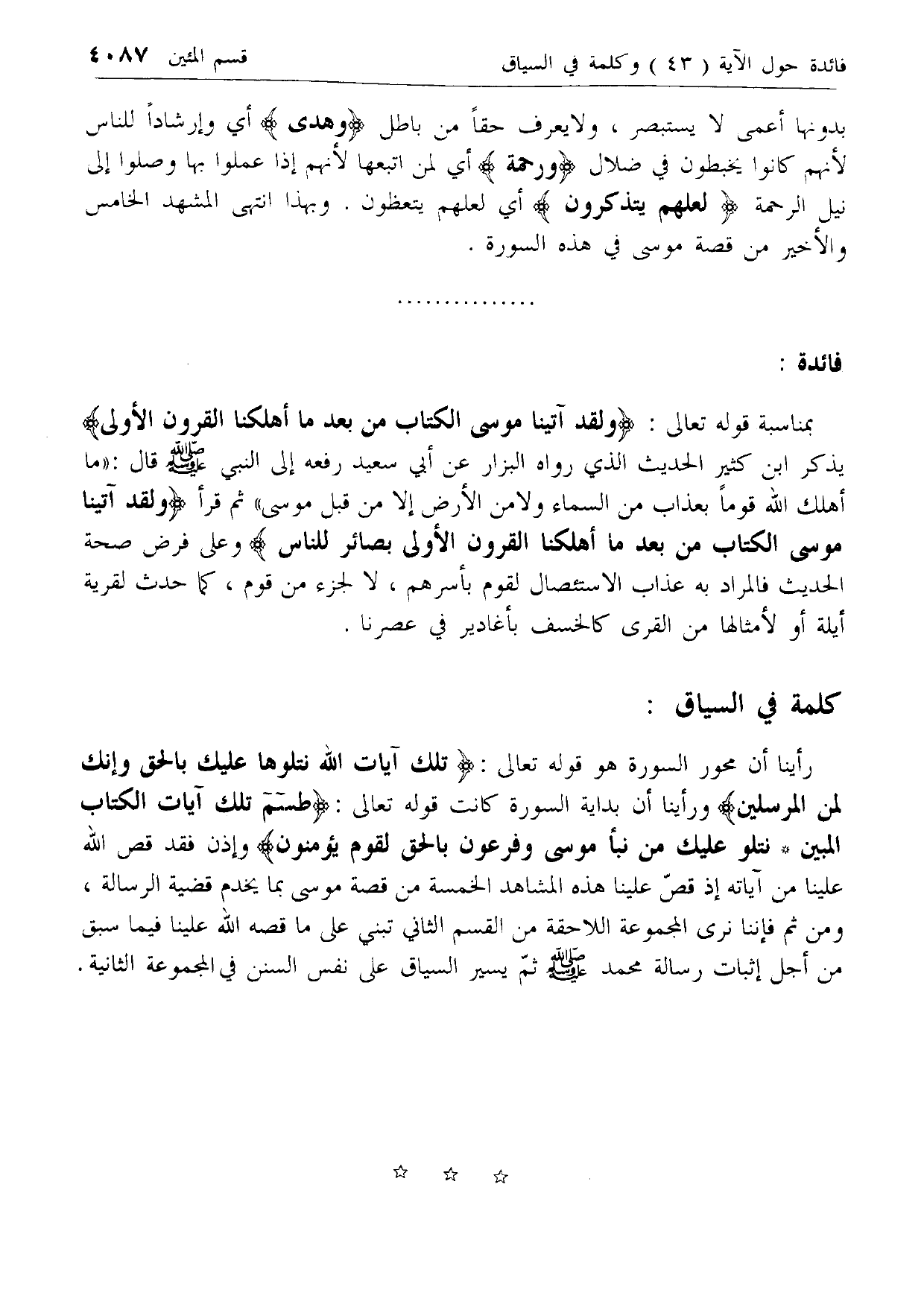 بمناسبة قوله تعالى: وَلَقَدْ آتَيْنا مُوسَى الْكِتابَ مِنْ بَعْدِ ما أَهْلَكْنَا الْقُرُونَ الْأُولى يذكر ابن كثير الحديث الذي رواه البزار عن أبي سعيد رفعه إلى النبي صلى الله عليه وسلم قال: «ما أهلك الله قوما بعذاب من السماء ولا من الأرض إلا من قبل موسى» ثم قرأ وَلَقَدْ آتَيْنا مُوسَى الْكِتابَ مِنْ بَعْدِ ما أَهْلَكْنَا الْقُرُونَ الْأُولى بَصائِرَ لِلنَّاسِ وعلى فرض صحة الحديث فالمراد به عذاب الاستئصال لقوم بأسرهم، لا لجزء من قوم، كما حدث لقرية أيلة أو لأمثالها من القرى كالخسف بأغادير في عصرنا.