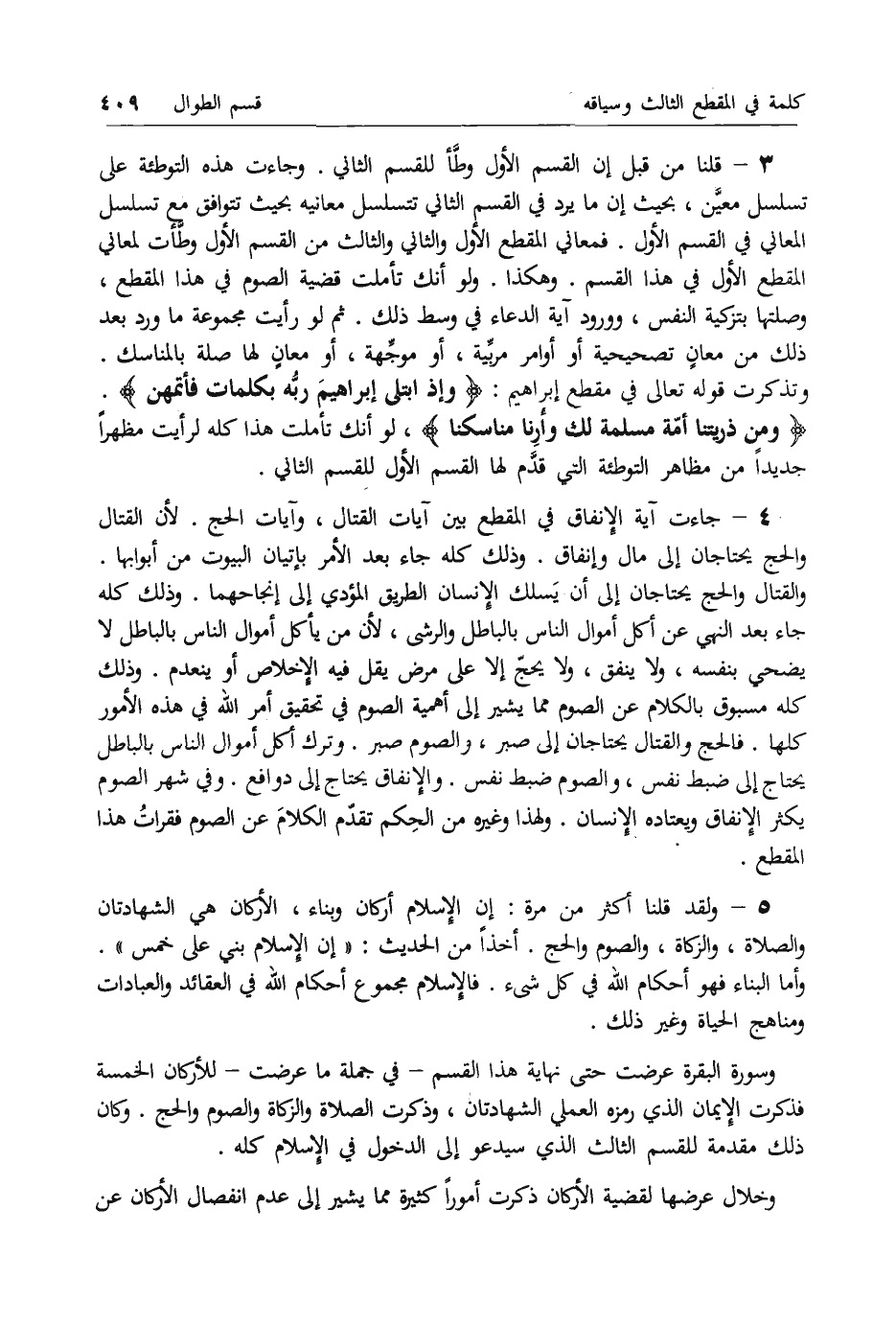 وسورة البقرة عرضت حتى نهاية هذا القسم- في جملة ما عرضت- للأركان الخمسة فذكرت الإيمان الذي رمزه العملي الشهادتان، وذكرت الصلاة والزكاة والصوم والحج. وكان ذلك مقدمة للقسم الثالث الذي سيدعو إلى الدخول في الإسلام كله.
