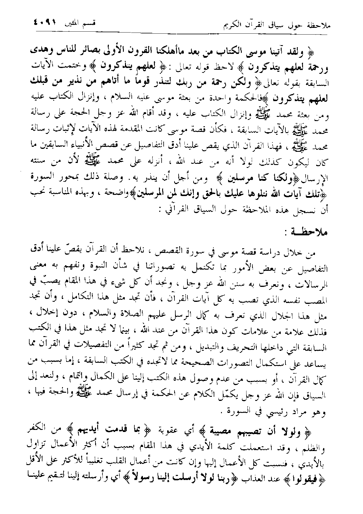 وَلَقَدْ آتَيْنا مُوسَى الْكِتابَ مِنْ بَعْدِ ما أَهْلَكْنَا الْقُرُونَ الْأُولى بَصائِرَ لِلنَّاسِ وَهُدىً وَرَحْمَةً لَعَلَّهُمْ يَتَذَكَّرُونَ لاحظ قوله تعالى: لَعَلَّهُمْ يَتَذَكَّرُونَ وختمت الآيات السابقة بقوله تعالى وَلكِنْ رَحْمَةً مِنْ رَبِّكَ لِتُنْذِرَ قَوْماً ما أَتاهُمْ مِنْ نَذِيرٍ مِنْ قَبْلِكَ لَعَلَّهُمْ يَتَذَكَّرُونَ فالحكمة واحدة من بعثة موسى عليه السلام، وإنزال الكتاب عليه ومن بعثة محمد صلى الله عليه وسلم وإنزال الكتاب عليه، وقد أقام الله عزّ وجل الحجة على رسالة محمد صلى الله عليه وسلم بالآيات السابقة، فكأن قصة موسى كانت المقدمة لهذه الآيات