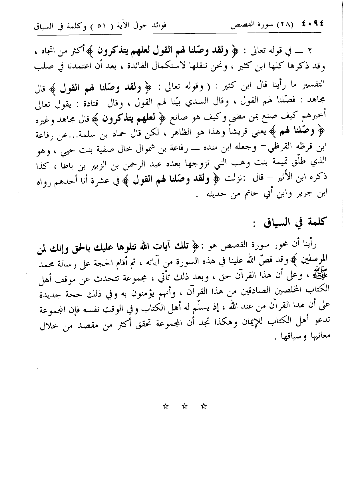 2 - في قوله تعالى: وَلَقَدْ وَصَّلْنا لَهُمُ الْقَوْلَ لَعَلَّهُمْ يَتَذَكَّرُونَ أكثر من اتجاه، وقد ذكرها كلها ابن كثير، ونحن ننقلها لاستكمال الفائدة، بعد أن اعتمدنا في صلب التفسير ما رأينا قال ابن كثير: (وقوله تعالى: وَلَقَدْ وَصَّلْنا لَهُمُ الْقَوْلَ قال مجاهد: فصلنا لهم القول، وقال السدي بينا لهم القول، وقال قتادة: يقول تعالى أخبرهم كيف صنع بمن مضى وكيف هو صانع لَعَلَّهُمْ يَتَذَكَّرُونَ قال مجاهد وغيره وَصَّلْنا لَهُمُ يعني قريشا وهذا هو الظاهر، لكن قال حماد بن سلمة ... عن رفاعة ابن قرظه القرظي- وجعله ابن مندة- رفاعة بن شموال خال صفية بنت حيي، وهو الذي طلق تميمة بنت وهب التي تزوجها بعده عبد الرحمن بن الزبير بن باطا، كذا ذكره ابن الأثير- قال: نزلت وَلَقَدْ وَصَّلْنا لَهُمُ الْقَوْلَ في عشرة أنا أحدهم رواه ابن جرير وابن أبي حاتم من حديثه.
