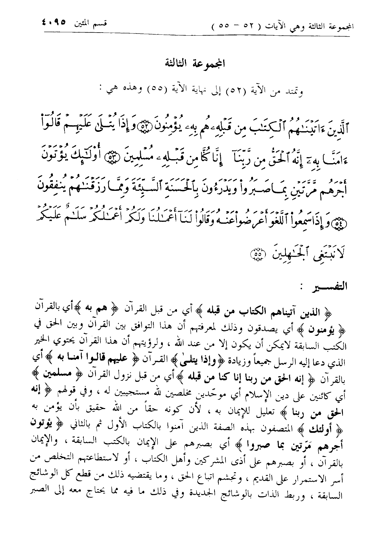 الَّذِينَ آتَيْناهُمُ الْكِتابَ مِنْ قَبْلِهِ هُمْ بِهِ يُؤْمِنُونَ (52) وَإِذا يُتْلى عَلَيْهِمْ قالُوا آمَنَّا بِهِ إِنَّهُ الْحَقُّ مِنْ رَبِّنا إِنَّا كُنَّا مِنْ قَبْلِهِ مُسْلِمِينَ (53) أُولئِكَ يُؤْتَوْنَ أَجْرَهُمْ مَرَّتَيْنِ بِما صَبَرُوا وَيَدْرَؤُنَ بِالْحَسَنَةِ السَّيِّئَةَ وَمِمَّا رَزَقْناهُمْ يُنْفِقُونَ (54) وَإِذا سَمِعُوا اللَّغْوَ أَعْرَضُوا عَنْهُ وَقالُوا لَنا أَعْمالُنا وَلَكُمْ أَعْمالُكُمْ سَلامٌ عَلَيْكُمْ لا نَبْتَغِي الْجاهِلِينَ (55)