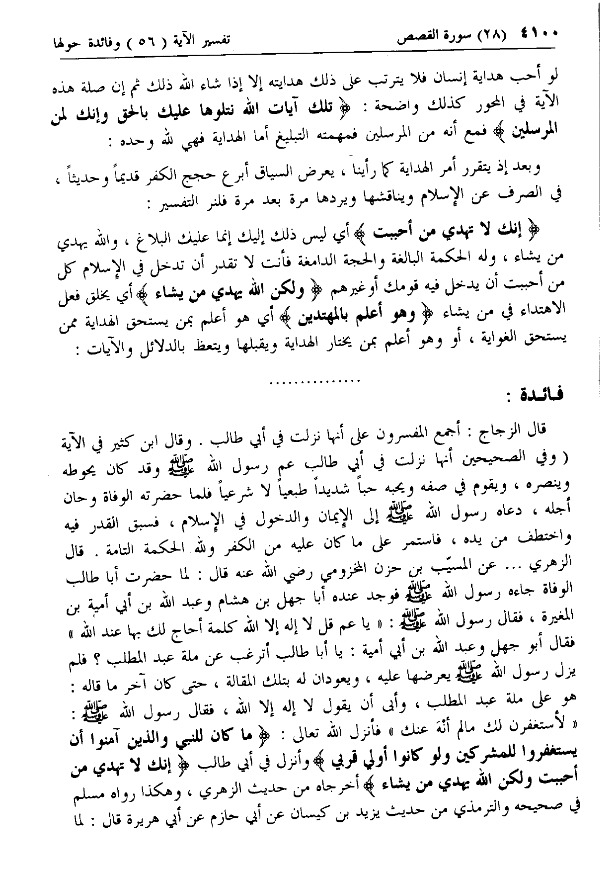 قال الزجاج: أجمع المفسرون على أنها نزلت في أبي طالب. وقال ابن كثير في الآية (وفي الصحيحين أنها نزلت في أبي طالب عم رسول الله صلى الله عليه وسلم وقد كان يحوطه وينصره، ويقوم في صفه ويحبه حبا شديدا طبعيا لا شرعيا فلما حضرته الوفاة وحان أجله، دعاه رسول الله صلى الله عليه وسلم إلى الإيمان والدخول في الإسلام، فسبق القدر فيه واختطف من يده، فاستمر على ما كان عليه من الكفر ولله الحكمة التامة. قال الزهري ... عن المسيب بن حزن المخزومي رضي الله عنه قال: لما حضرت أبا طالب الوفاة جاءه رسول الله صلى الله عليه وسلم فوجد عنده أبا جهل بن هشام وعبد الله بن أبي أمية بن المغيرة، فقال رسول الله صلى الله عليه وسلم: «يا عم قل لا إله إلا الله كلمة أحاج لك بها عند الله» فقال أبو جهل وعبد الله بن أبي أمية: يا أبا طالب أترغب عن ملة عبد المطلب؟ فلم يزل رسول الله صلى الله عليه وسلم يعرضها عليه، ويعودان له بتلك المقالة، حتى كان آخر ما قاله: