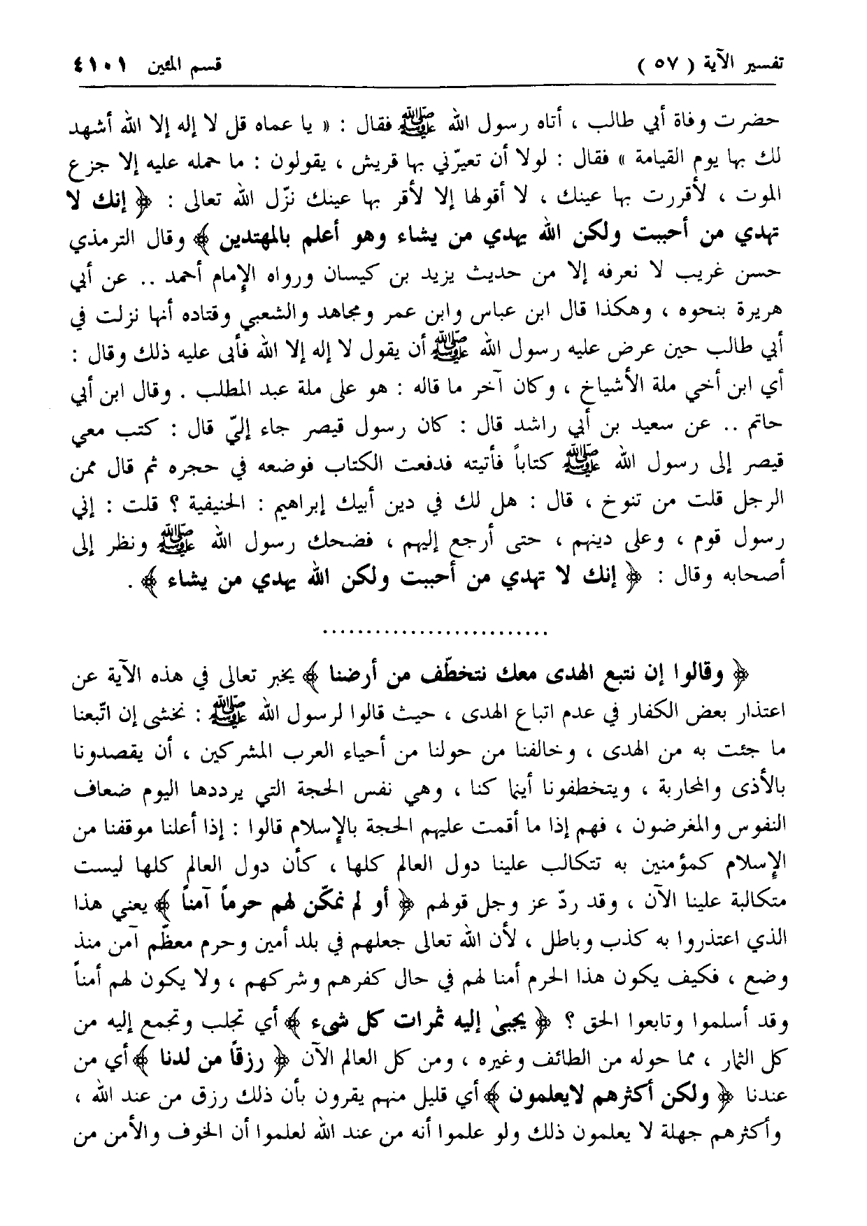 وَقالُوا إِنْ نَتَّبِعِ الْهُدى مَعَكَ نُتَخَطَّفْ مِنْ أَرْضِنا يخبر تعالى في هذه الآية عن اعتذار بعض الكفار في عدم اتباع الهدى، حيث قالوا لرسول الله صلى الله عليه وسلم: نخشى إن اتبعنا ما جئت به من الهدى، وخالفنا من حولنا من أحياء العرب المشركين، أن يقصدونا بالأذى والمحاربة، ويتخطفونا أينما كنا، وهي نفس الحجة التي يرددها اليوم ضعاف النفوس والمغرضون، فهم إذا ما أقمت عليهم الحجة بالإسلام قالوا: إذا أعلنا موقفنا من الإسلام كمؤمنين به تتكالب علينا دول العالم كلها، كأن دول العالم كلها ليست متكالبة علينا الآن، وقد رد عزّ وجل قولهم أَوَلَمْ نُمَكِّنْ لَهُمْ حَرَماً آمِناً يعني هذا الذي اعتذروا به كذب وباطل، لأن الله تعالى جعلهم في بلد أمين وحرم معظم آمن منذ وضع، فكيف يكون هذا الحرم أمنا لهم في حال كفرهم وشركهم، ولا يكون لهم أمنا وقد أسلموا وتابعوا الحق؟ يُجْبى إِلَيْهِ ثَمَراتُ كُلِّ شَيْءٍ أي تجلب وتجمع إليه من كل الثمار، مما حوله من الطائف وغيره، ومن كل العالم الآن رِزْقاً مِنْ لَدُنَّا أي من عندنا وَلكِنَّ أَكْثَرَهُمْ لا يَعْلَمُونَ أي قليل منهم يقرون بأن ذلك رزق من عند الله، وأكثرهم جهلة لا يعلمون ذلك ولو علموا أنه من عند الله لعلموا أن الخوف والأمن من