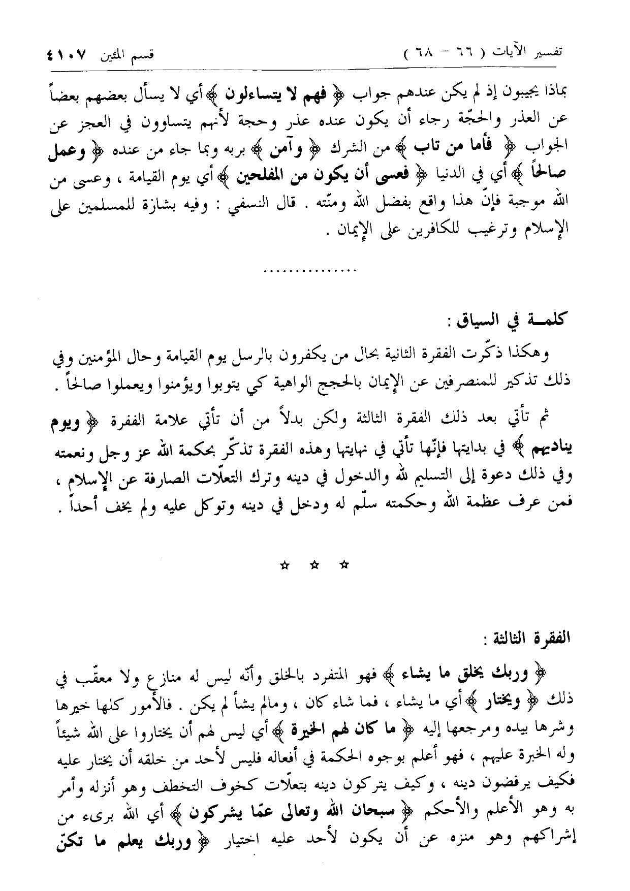ثم تأتي بعد ذلك الفقرة الثالثة ولكن بدلا من أن تأتي علامة الفقرة وَيَوْمَ يُنادِيهِمْ في بدايتها فإنها تأتي في نهايتها وهذه الفقرة تذكر بحكمة الله عزّ وجل ونعمته وفي ذلك دعوة إلى التسليم لله والدخول في دينه وترك التعلات الصارفة عن الإسلام، فمن عرف عظمة الله وحكمته سلم له ودخل في دينه وتوكل عليه ولم يخف أحدا.