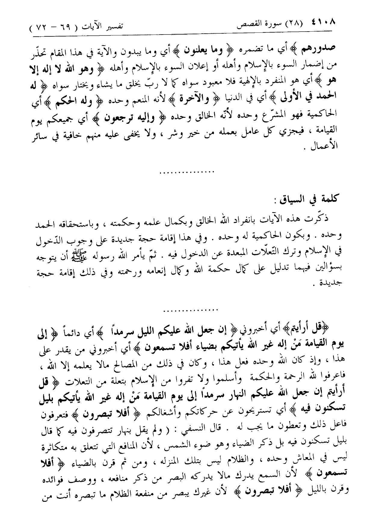 قُلْ أَرَأَيْتُمْ إِنْ جَعَلَ اللَّهُ عَلَيْكُمُ النَّهارَ سَرْمَداً إِلى يَوْمِ الْقِيامَةِ مَنْ إِلهٌ غَيْرُ اللَّهِ يَأْتِيكُمْ بِلَيْلٍ تَسْكُنُونَ فِيهِ أي تستريحون عن حركاتكم وأشغالكم أَفَلا تُبْصِرُونَ فتعرفون فاعل ذلك وتعطون ما يجب له. قال النسفي: (ولم يقل بنهار تتصرفون فيه كما قال بليل تسكنون فيه بل ذكر الضياء وهو ضوء الشمس، لأن المنافع التي تتعلق به متكاثرة ليس في المعاش وحده، والظلام ليس بتلك المنزلة، ومن ثم قرن بالضياء أَفَلا تَسْمَعُونَ لأن السمع يدرك ما لا يدركه البصر من ذكر منافعه، ووصف فوائده وقرن بالليل أَفَلا تُبْصِرُونَ لأن غيرك يبصر من منفعة الظلام ما تبصره أنت من