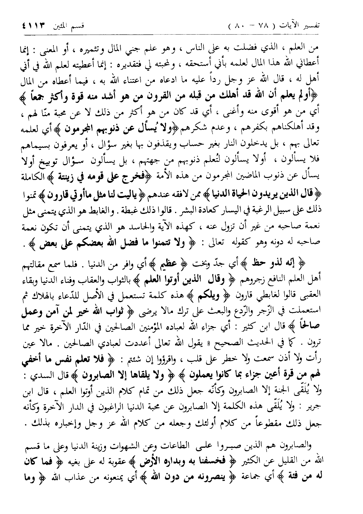 وَقالَ الَّذِينَ أُوتُوا الْعِلْمَ بالثواب والعقاب وفناء الدنيا وبقاء العقبى قالوا لغابطي قارون وَيْلَكُمْ هذه كلمة تستعمل في الأصل للدعاء بالهلاك ثم استعملت في الزجر والردع والبعث على ترك ما لا يرضى ثَوابُ اللَّهِ خَيْرٌ لِمَنْ آمَنَ وَعَمِلَ صالِحاً قال ابن كثير: أي جزاء الله لعباده المؤمنين الصالحين في الدار الآخرة خير مما ترون. كما في الحديث الصحيح «يقول الله تعالى أعددت لعبادي الصالحين. ما لا عين رأت ولا أذن سمعت ولا خطر على قلب، واقرءوا إن شئتم: فَلا تَعْلَمُ نَفْسٌ ما أُخْفِيَ لَهُمْ مِنْ قُرَّةِ أَعْيُنٍ جَزاءً بِما كانُوا يَعْمَلُونَ وَلا يُلَقَّاها إِلَّا الصَّابِرُونَ قال السدي: