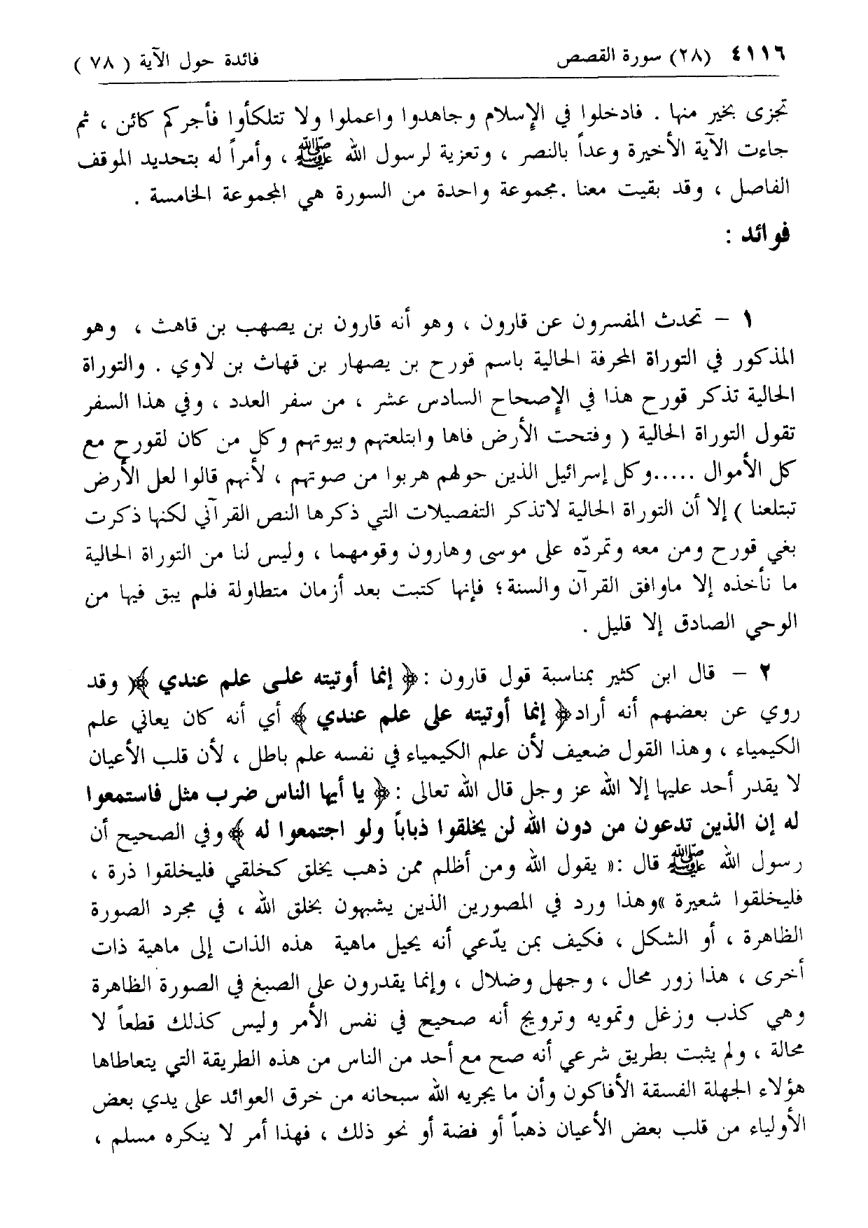 2 - قال ابن كثير بمناسبة قول قارون: إِنَّما أُوتِيتُهُ عَلى عِلْمٍ عِنْدِي (وقد روي عن بعضهم أنه أراد إِنَّما أُوتِيتُهُ عَلى عِلْمٍ عِنْدِي أي أنه كان يعاني علم الكيمياء، وهذا القول ضعيف لأن علم الكيمياء في نفسه علم باطل، لأن قلب الأعيان لا يقدر أحد عليها إلا الله عزّ وجل قال الله تعالى: يا أَيُّهَا النَّاسُ ضُرِبَ مَثَلٌ فَاسْتَمِعُوا لَهُ إِنَّ الَّذِينَ تَدْعُونَ مِنْ دُونِ اللَّهِ لَنْ يَخْلُقُوا ذُباباً وَلَوِ اجْتَمَعُوا لَهُ وفي الصحيح أن رسول الله صلى الله عليه وسلم قال: «يقول الله ومن أظلم ممن ذهب يخلق كخلقي فليخلقوا ذرة، فليخلقوا شعيرة» وهذا ورد في المصورين الذين يشبهون بخلق الله، في مجرد الصورة الظاهرة، أو الشكل، فكيف بمن يدعي أنه يحيل ماهية هذه الذات إلى ماهية ذات أخرى، هذا زور محال، وجهل وضلال، وإنما يقدرون على الصبغ في الصورة الظاهرة وهي كذب وزغل وتمويه وترويج أنه صحيح في نفس الأمر وليس كذلك قطعا لا محالة، ولم يثبت بطريق شرعي أنه صح مع أحد من الناس من هذه الطريقة التي يتعاطاها هؤلاء الجهلة الفسقة الأفاكون وأن ما يجريه الله سبحانه من خرق العوائد على يدي بعض الأولياء من قلب بعض الأعيان ذهبا أو فضة أو نحو ذلك، فهذا أمر لا ينكره مسلم،