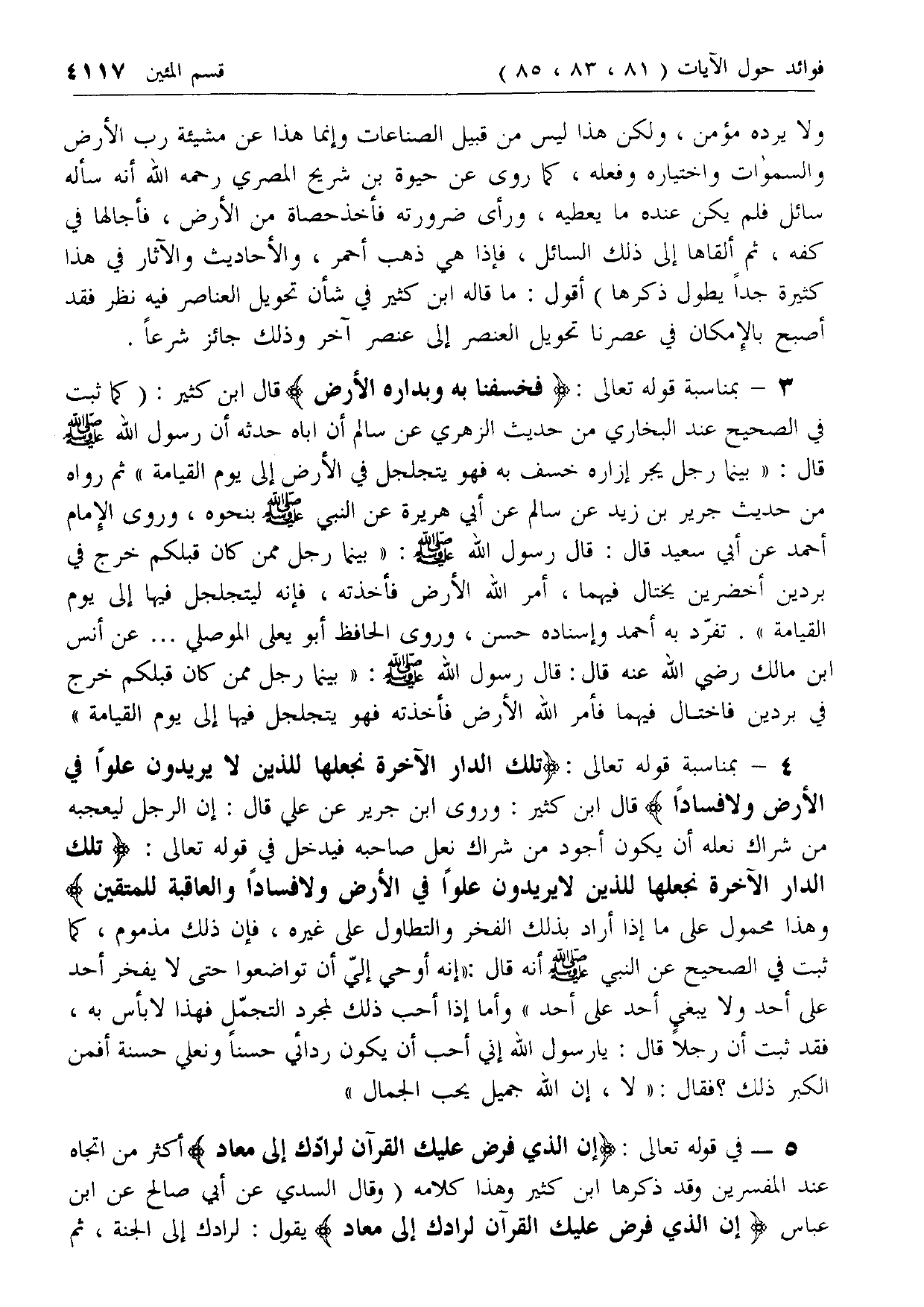 3 - بمناسبة قوله تعالى: فَخَسَفْنا بِهِ وَبِدارِهِ الْأَرْضَ قال ابن كثير: (كما ثبت في الصحيح عند البخاري من حديث الزهري عن سالم أن اباه حدثه أن رسول الله صلى الله عليه وسلم قال: «بينما رجل يجر إزاره خسف به فهو يتجلجل في الأرض إلى يوم القيامة» ثم رواه من حديث جرير بن زيد عن سالم عن أبي هريرة عن النبي صلى الله عليه وسلم بنحوه، وروى الإمام أحمد عن أبي سعيد قال: قال رسول الله صلى الله عليه وسلم: «بينما رجل ممن كان قبلكم خرج في بردين أخضرين يختال فيهما، أمر الله الأرض فأخذته، فإنه ليتجلجل فيها إلى يوم القيامة». تفرد به أحمد وإسناده حسن، وروى الحافظ أبو يعلى الموصلي ... عن أنس ابن مالك رضي الله عنه قال: قال رسول الله صلى الله عليه وسلم: «بينما رجل ممن كان قبلكم خرج في بردين فاختال فيهما فأمر الله الأرض فأخذته فهو يتجلجل فيها إلى يوم القيامة»
