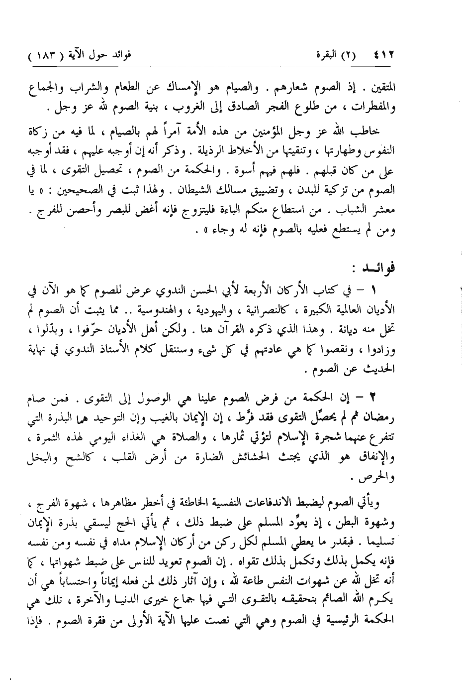 1 - في كتاب الأركان الأربعة لأبي الحسن الندوي عرض للصوم كما هو الآن في الأديان العالمية الكبيرة، كالنصرانية، واليهودية، والهندوسية .. مما يثبت أن الصوم لم تخل منه ديانة. وهذا الذي ذكره القرآن هنا. ولكن أهل الأديان حرفوا، وبدلوا، وزادوا، ونقصوا كما هي عادتهم في كل شئ وسننقل كلام الأستاذ الندوي في نهاية الحديث عن الصوم.