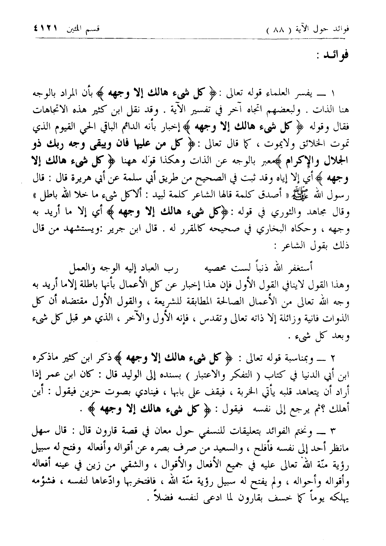 1 - يفسر العلماء قوله تعالى: كُلُّ شَيْءٍ هالِكٌ إِلَّا وَجْهَهُ بأن المراد بالوجه هنا الذات. ولبعضهم اتجاه آخر في تفسير الآية. وقد نقل ابن كثير هذه الاتجاهات فقال وقوله كُلُّ شَيْءٍ هالِكٌ إِلَّا وَجْهَهُ إخبار بأنه الدائم الباقي الحي القيوم الذي تموت الخلائق ولا يموت، كما قال تعالى: كُلُّ مَنْ عَلَيْها فانٍ وَيَبْقى وَجْهُ رَبِّكَ ذُو الْجَلالِ وَالْإِكْرامِ معبر بالوجه عن الذات وهكذا قوله هاهنا كُلُّ شَيْءٍ هالِكٌ إِلَّا وَجْهَهُ أي إلا إياه وقد ثبت في الصحيح من طريق أبي سلمة عن أبي هريرة قال: قال رسول الله صلى الله عليه وسلم «أصدق كلمة قالها الشاعر كلمة لبيد: ألا كل شئ ما خلا الله باطل» وقال مجاهد والثوري في قوله: كُلُّ شَيْءٍ هالِكٌ إِلَّا وَجْهَهُ أي إلا ما أريد به وجهه، وحكاه البخاري في صحيحه كالمقرر له. قال ابن جرير: ويستشهد من قال ذلك بقول الشاعر: