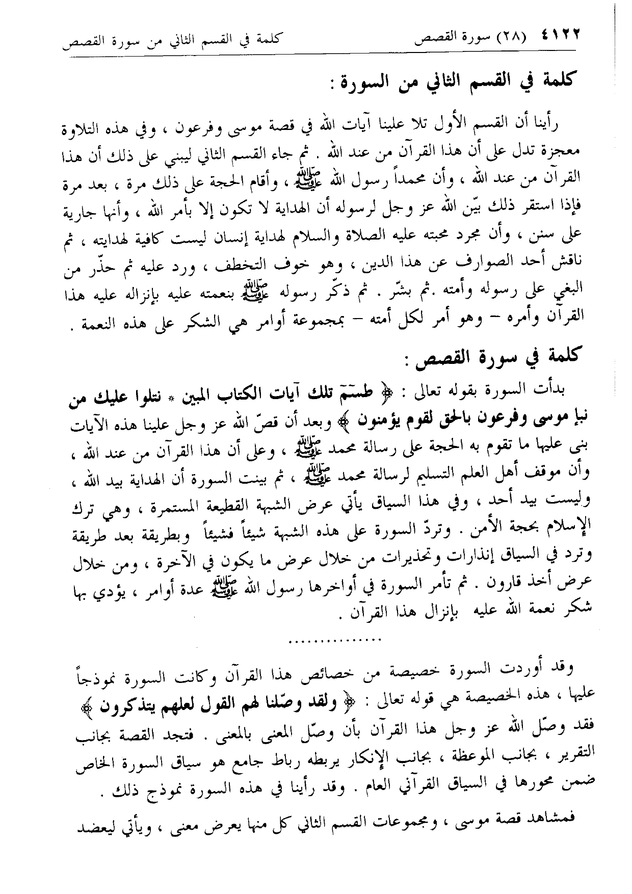 رأينا أن القسم الأول تلا علينا آيات الله في قصة موسى وفرعون، وفي هذه التلاوة معجزة تدل على أن هذا القرآن من عند الله. ثم جاء القسم الثاني ليبني على ذلك أن هذا القرآن من عند الله، وأن محمدا رسول الله صلى الله عليه وسلم، وأقام الحجة على ذلك مرة، بعد مرة فإذا استقر ذلك بين الله عزّ وجل لرسوله أن الهداية لا تكون إلا بأمر الله، وأنها جارية على سنن، وأن مجرد محبته عليه الصلاة والسلام لهداية إنسان ليست كافية لهدايته، ثم ناقش أحد الصوارف عن هذا الدين، وهو خوف التخطف، ورد عليه ثم حذر من البغي على رسوله وأمته. ثم بشر. ثم ذكر رسوله صلى الله عليه وسلم بنعمته عليه بإنزاله عليه هذا القرآن وأمره- وهو أمر لكل أمته- بمجموعة أوامر هي الشكر على هذه النعمة.
