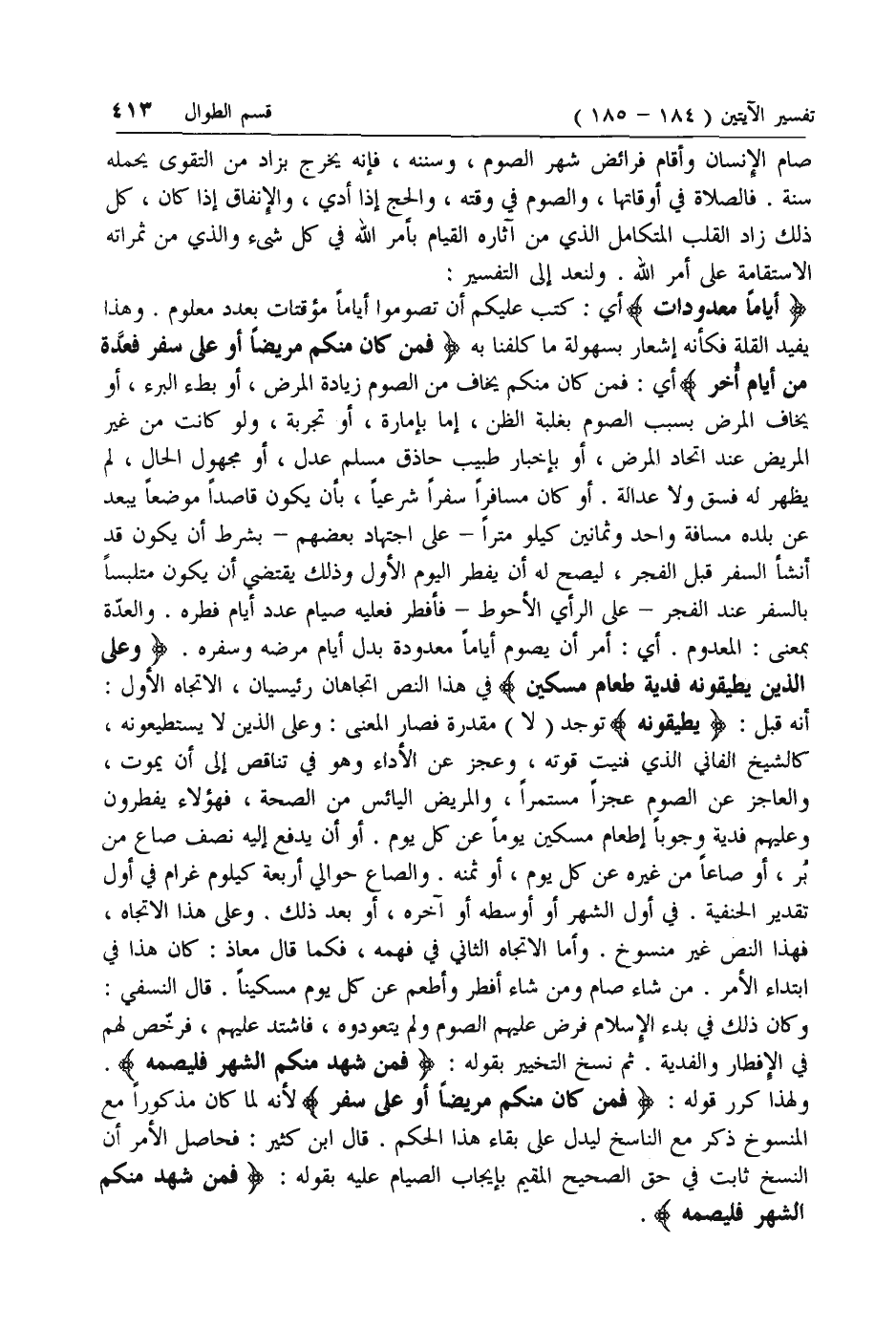 أَيَّاماً مَعْدُوداتٍ أي: كتب عليكم أن تصوموا أياما مؤقتات بعدد معلوم. وهذا يفيد القلة فكأنه إشعار بسهولة ما كلفنا به فَمَنْ كانَ مِنْكُمْ مَرِيضاً أَوْ عَلى سَفَرٍ فَعِدَّةٌ مِنْ أَيَّامٍ أُخَرَ أي: فمن كان منكم يخاف من الصوم زيادة المرض، أو بطء البرء، أو يخاف المرض بسبب الصوم بغلبة الظن، إما بإمارة، أو تجربة، ولو كانت من غير المريض عند اتحاد المرض، أو بإخبار طبيب حاذق مسلم عدل، أو مجهول الحال، لم يظهر له فسق ولا عدالة. أو كان مسافرا سفرا شرعيا، بأن يكون قاصدا موضعا يبعد عن بلده مسافة واحد وثمانين كيلومترا- على اجتهاد بعضهم- بشرط أن يكون قد أنشأ السفر قبل الفجر، ليصح له أن يفطر اليوم الأول وذلك يقتضي أن يكون متلبسا بالسفر عند الفجر- على الرأي الأحوط- فأفطر فعليه صيام عدد أيام فطره. والعدة بمعنى: المعدوم. أي: أمر أن يصوم أياما معدودة بدل أيام مرضه وسفره. وَعَلَى الَّذِينَ يُطِيقُونَهُ فِدْيَةٌ طَعامُ مِسْكِينٍ في هذا النص اتجاهان رئيسيان، الاتجاه الأول:
