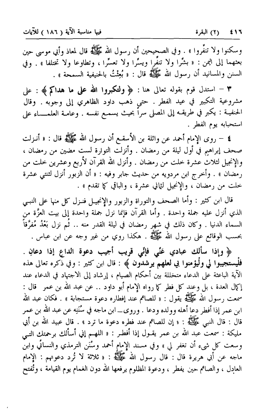 وَإِذا سَأَلَكَ عِبادِي عَنِّي فَإِنِّي قَرِيبٌ أُجِيبُ دَعْوَةَ الدَّاعِ إِذا دَعانِ. فَلْيَسْتَجِيبُوا لِي وَلْيُؤْمِنُوا بِي لَعَلَّهُمْ يَرْشُدُونَ: قال ابن كثير: وفي ذكره تعالى هذه الآية الباعثة على الدعاء متخللة بين أحكام الصيام، إرشاد إلى الاجتهاد في الدعاء عند إكمال العدة، بل وعند كل فطر كما رواه الإمام أبو داود .. عن عبد الله بن عمر قال:
