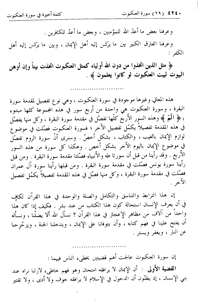 هذه المعاني وغيرها موجودة في سورة العنكبوت، وهي نوع تفصيل لمقدمة سورة البقرة، وسورة العنكبوت هي واحدة من أربع سور في هذه المجموعة كلها مبدوء ب الم وهذه السور الأربع كلّها تفصّل في مقدمة سورة البقرة، وكل منها يفصّل في هذه المقدمة تفصيلا يكمّل تفصيل الآخر؛ فسورة العنكبوت فصّلت في موضوع لوازم الإيمان بالغيب، والكتاب، بشكل أخصّ. وسنرى أنّ سورة الروم تفصّل في موضوع الإيمان باليوم الآخر بشكل أخص. وهكذا كل سورة من هذه السور الأربع. وقد رأينا من قبل أن سورتا طه والأنبياء فصّلتا مقدمة سورة البقرة. ومن قبل رأينا سورة يونس فصّلت في مقدمة سورة البقرة. ومن قبلها رأينا سورة آل عمران فصّلت في مقدمة سورة البقرة، وكل منها فصّل في هذه المقدمة تفصيلا يكمّل تفصيل الآخر.