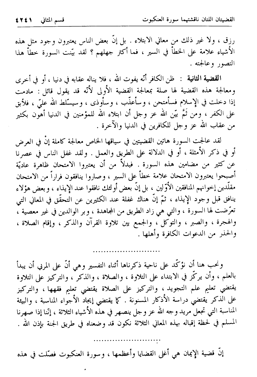 لقد عالجت السورة هاتين القضيتين في سياقها الخاص معالجة كاملة إن في العرض أو في ذكر الأمثلة، أو في الدلالة على الطريق والعمل. ولقد غفل الناس في عصرنا عن كثير من مضامين هذه السورة. فبدلا من أن يعتبروا الامتحان ظاهرة عاديّة أصبحوا يعتبرون الامتحان علامة خطأ على السير، وصاروا ينافقون فرارا من الامتحان مقلّدين إخوانهم المنافقين الأوّلين، بل إنّ بعض أولئك نافقوا عند الإيذاء، وبعض هؤلاء ينافق قبل وجود الإيذاء، ثمّ إنّ هناك غفلة عند الكثيرين عن التحقّق في المعاني التي تعرّضت لها السورة، والتي هي زاد الطريق من المجاهدة، وبر الوالدين في غير معصية، والهجرة، والصبر، والتوكل، والجمع بين تلاوة القرآن والذكر، وإقام الصلاة، والحذر من الدعوات الكافرة وأهلها.