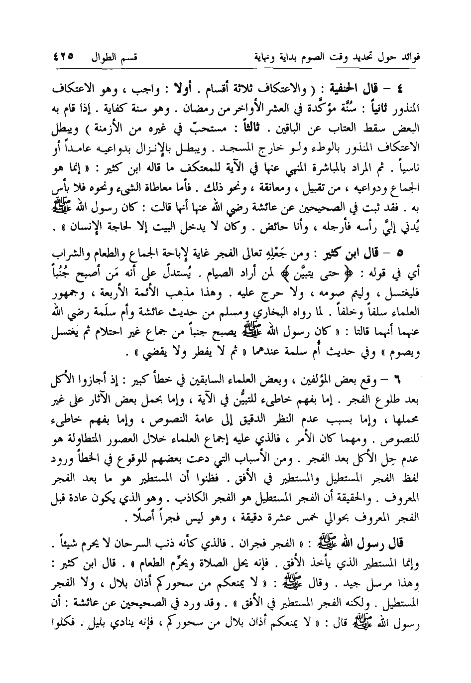 6 - وقع بعض المؤلفين، وبعض العلماء السابقين في خطأ كبير: إذ أجازوا الأكل بعد طلوع الفجر. إما بفهم خاطئ للتبين في الآية، وإما بحمل بعض الآثار على غير محملها، وإما بسبب عدم النظر الدقيق إلى عامة النصوص، وإما بفهم خاطئ للنصوص. ومهما كان الأمر، فالذي عليه إجماع العلماء خلال العصور المتطاولة هو عدم حل الأكل بعد الفجر. ومن الأسباب التي دعت بعضهم للوقوع في الخطأ ورود لفظ الفجر المستطيل والمستطير في الأفق. فظنوا أن المستطير هو ما بعد الفجر المعروف. والحقيقة أن الفجر المستطيل هو الفجر الكاذب. وهو الذي يكون عادة قبل الفجر المعروف بحوالي خمس عشرة دقيقة، وهو ليس فجرا أصلا.