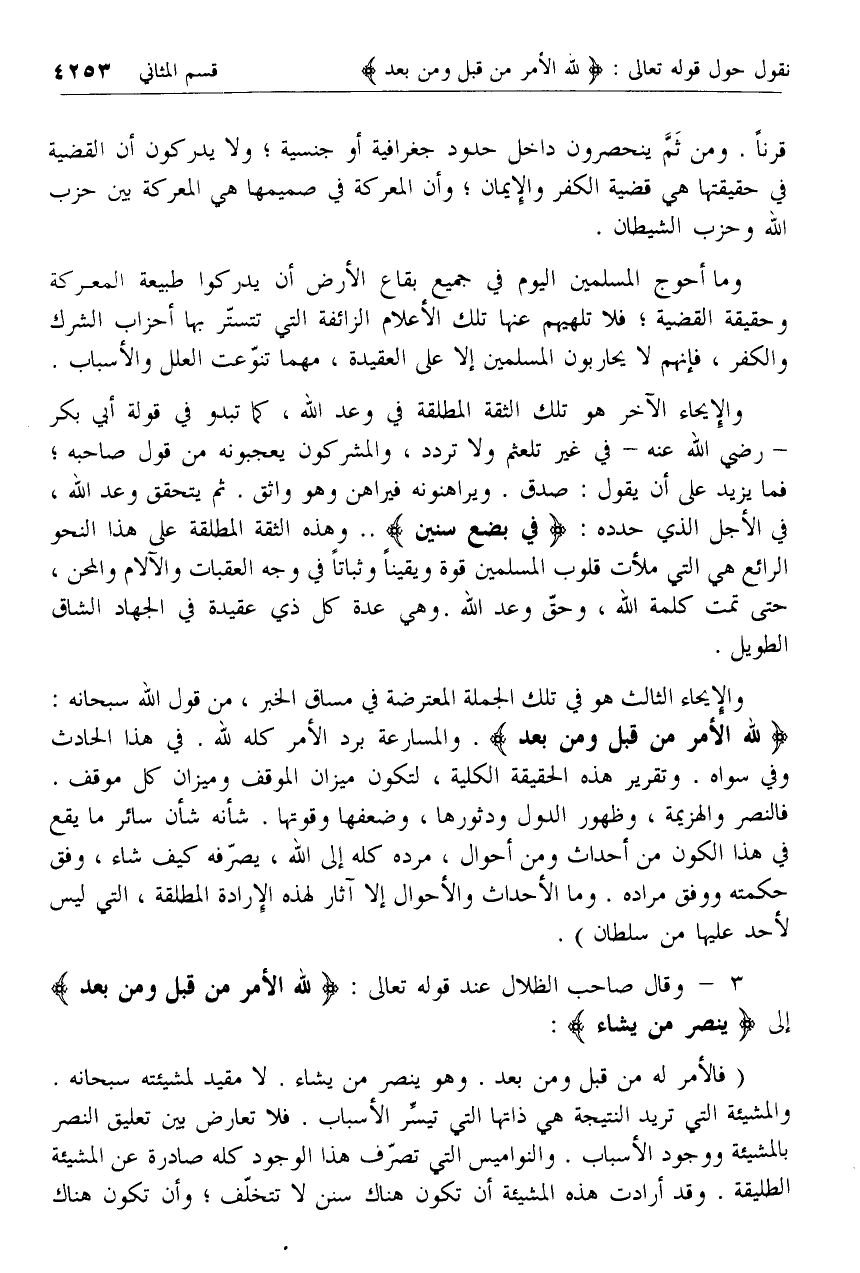 3 - وقال صاحب الظلال عند قوله تعالى: لِلَّهِ الْأَمْرُ مِنْ قَبْلُ وَمِنْ بَعْدُ إلى يَنْصُرُ مَنْ يَشاءُ: