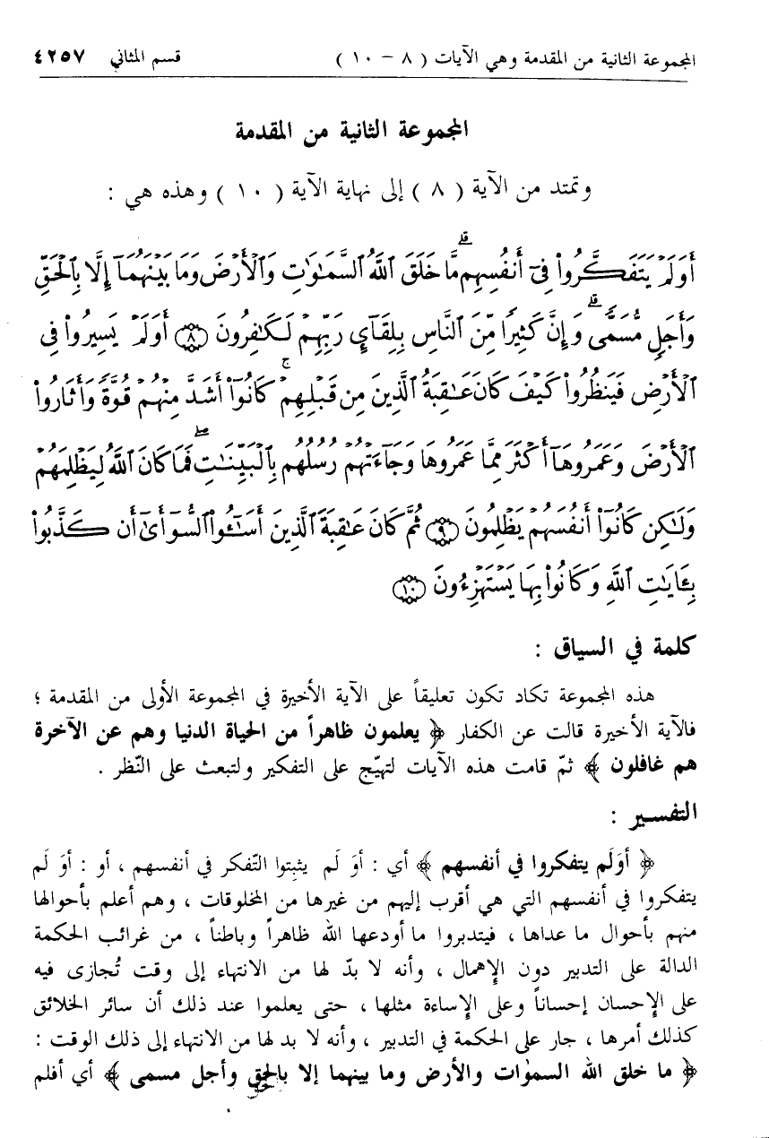 هذه المجموعة تكاد تكون تعليقا على الآية الأخيرة في المجموعة الأولى من المقدمة؛ فالآية الأخيرة قالت عن الكفار يَعْلَمُونَ ظاهِراً مِنَ الْحَياةِ الدُّنْيا وَهُمْ عَنِ الْآخِرَةِ هُمْ غافِلُونَ ثمّ قامت هذه الآيات لتهيّج على التفكير ولتبعث على النّظر.