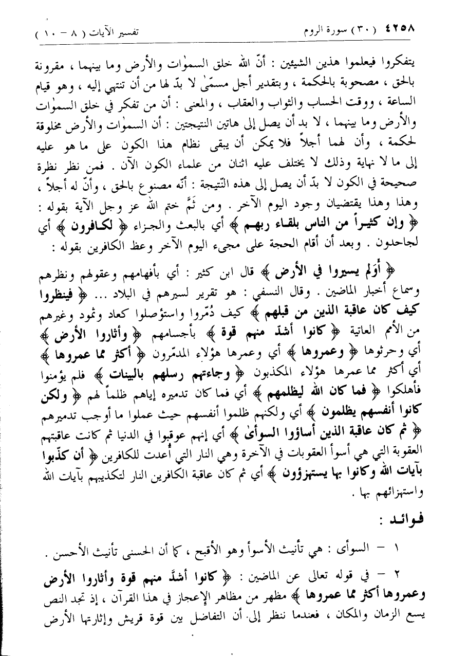 يتفكروا فيعلموا هذين الشيئين: أنّ الله خلق السموات والأرض وما بينهما، مقرونة بالحق، مصحوبة بالحكمة، وبتقدير أجل مسمّى لا بدّ لها من أن تنتهي إليه، وهو قيام الساعة، ووقت الحساب والثواب والعقاب، والمعنى: أن من تفكر في خلق السموات والأرض وما بينهما، لا بد أن يصل إلى هاتين النتيجتين: أن السموات والأرض مخلوقة لحكمة، وأن لهما أجلا فلا يمكن أن يبقى نظام هذا الكون على ما هو عليه إلى ما لا نهاية وذلك لا يختلف عليه اثنان من علماء الكون الآن. فمن نظر نظرة صحيحة في الكون لا بدّ أن يصل إلى هذه النّتيجة: أنّه مصنوع بالحق، وأنّ له أجلا، وهذا وهذا يقتضيان وجود اليوم الآخر. ومن ثمّ ختم الله عزّ وجل الآية بقوله: