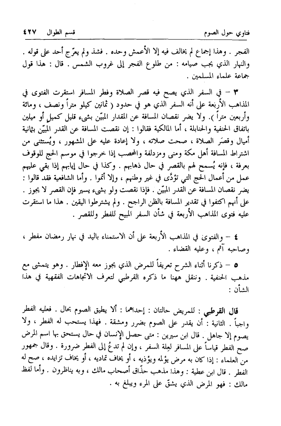 3 - في السفر الذي يصح فيه قصر الصلاة وفطر المسافر استقرت الفتوى في المذاهب الأربعة على أنه السفر الذي هو في حدود (ثمانين كيلو مترا ونصف، ومائة وأربعين مترا). ولا يضر نقصان المسافة عن المقدار المبين بشيء قليل كميل أو ميلين باتفاق الحنفية والحنابلة، أما المالكية فقالوا: إن نقصت المسافة عن القدر المبين بثمانية أميال وقصر الصلاة، صحت صلاته، ولا إعادة عليه على المشهور، ويستثنى من اشتراط المسافة أهل مكة ومنى ومزدلفة والمحصب إذا خرجوا في موسم الحج للوقوف بعرفة، فإنه يسمح لهم بالقصر في حال ذهابهم. وكذا في حال إيابهم إذا بقي عليهم عمل من أعمال الحج التي تؤدى في غير وطنهم، وإلا أتموا. وأما الشافعية فقد قالوا: